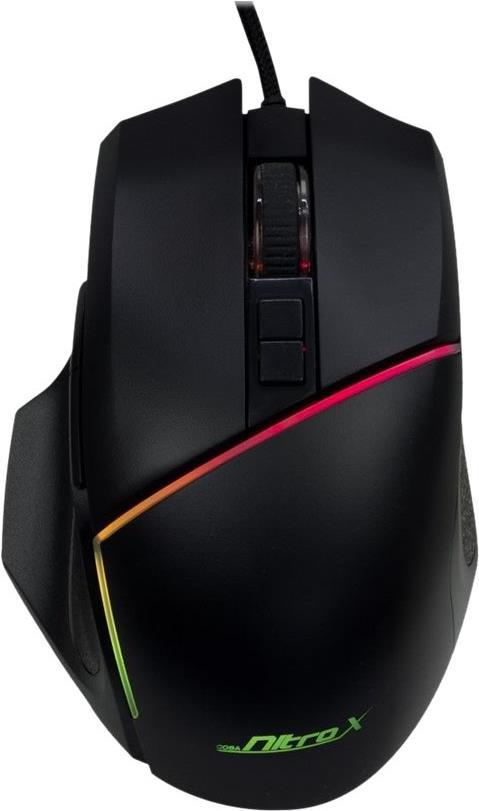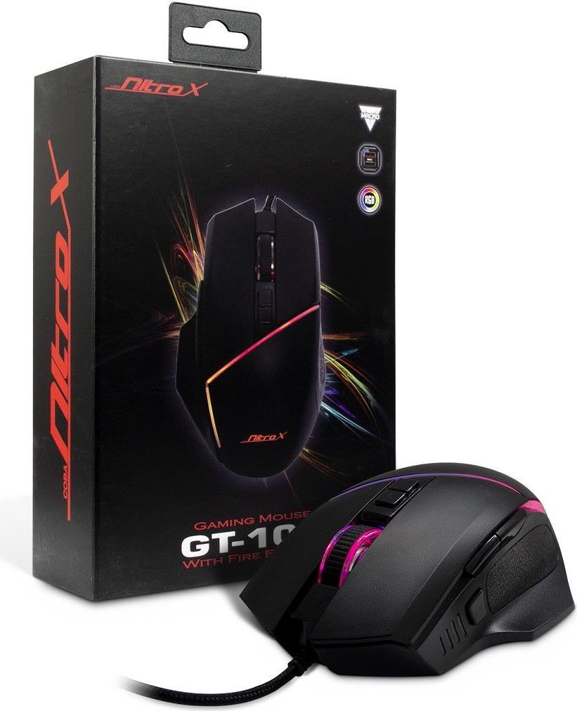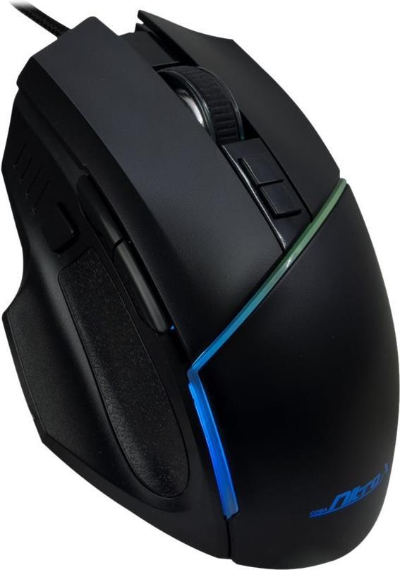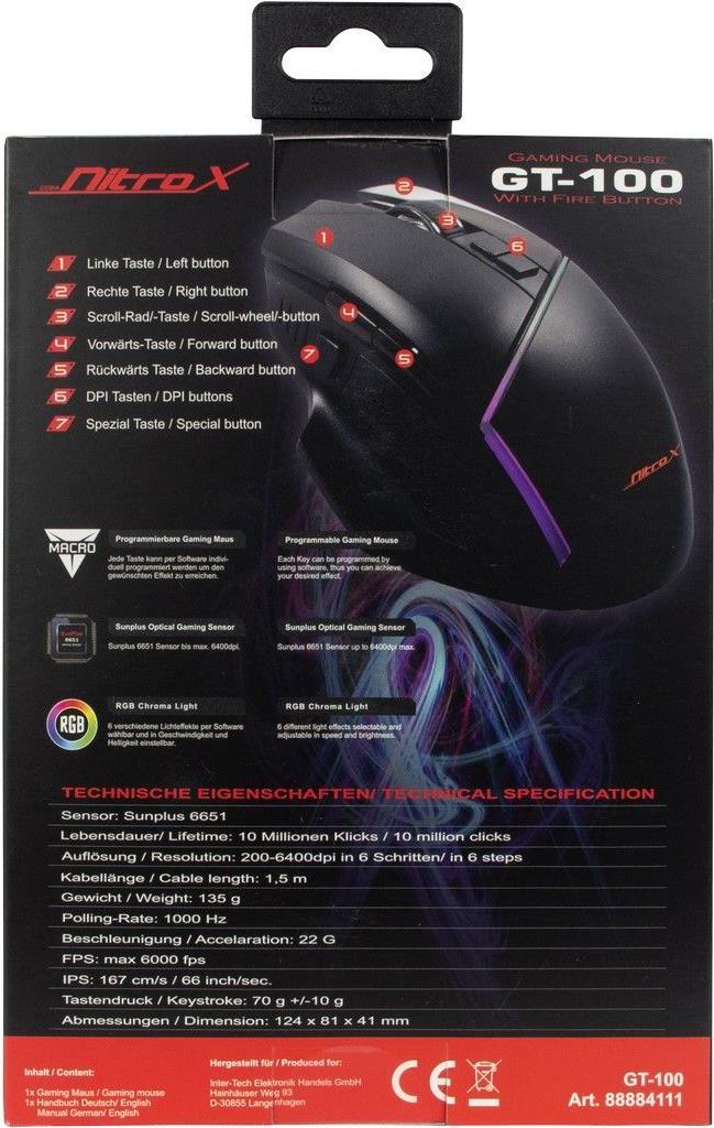 Die ergonomische Nitrox GT-100 RGB Gaming-Maus bietet Ihnen eine Vielzahl individueller Einstellmöglichkeiten. Dabei stehen über die Software 7 frei belegbare Makro-Tasten zur Verfügung, auf denen bevorzugte Befehle und Aktionen für verschiedene Spiele festgelegt werden können. Über die Software oder die integrierte dpi-Taste lässt sich spielend leicht die Geschwindigkeit des SUNPLUS 6651 Sensors der Maus, in sechs Stufen zwischen 200 - 6400 dpi, einstellen.Weitere Features sind die seitlich angebrachten Vorwärts-, Rückwärts- und Spezialtasten sowie die 6 wählbaren RGB-Effekte, die über die Software einstellbar sind. Das 1,50m lange USB-Kabel mit integriertem Ferritkern, macht unabhängig von Batterien und sorgt für einen störungsfreien Spielbetrieb. Hochwertige Klickschalter bieten zudem eine hohe Lebensdauer von weit über 10.000.000 Klicks.Hauptmerkmale