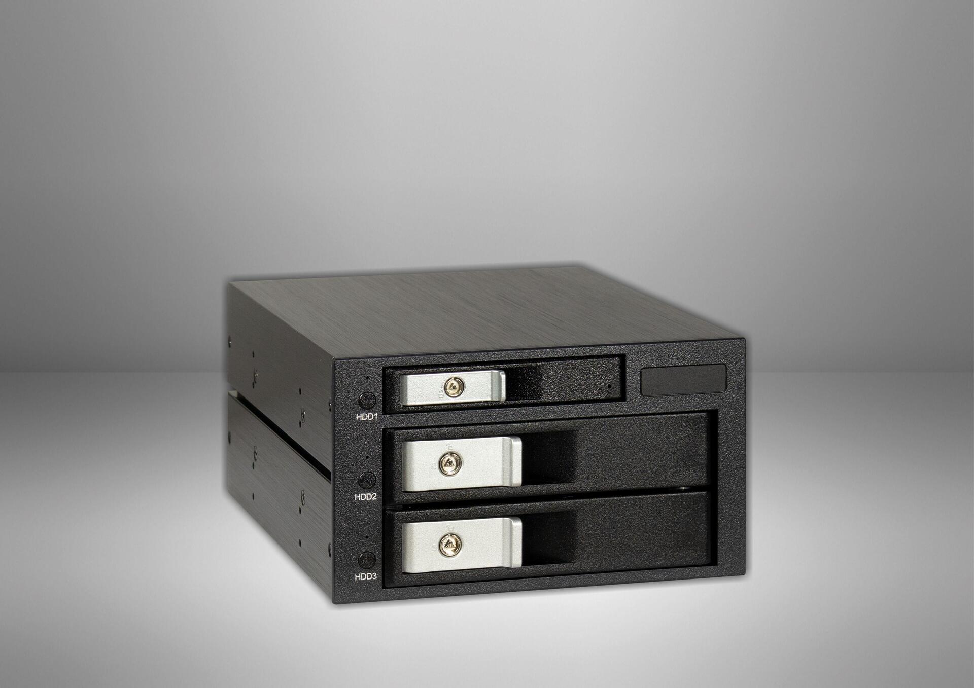 Kleines Hot-Swap-Gerät mit Unterstützung für eine 2,5\"- und zwei 3,5\"-Festplatten zur zusätzlichen Montage in zwei externen 5,25\"-Schächten.Sie können die Festplatten direkt in das Gerät einsetzen, ohne einen zusätzlichen Einbaurahmen zu verwenden. Beim Öffnen des Geräts schiebt ein intelligenter Mechanismus die Festplatte heraus, um sie leicht zu entfernen.Darüber hinaus kann jeder Hot-Swap-Rahmen separat verriegelt werden, um die Festplatten vor Diebstahl zu schützen.