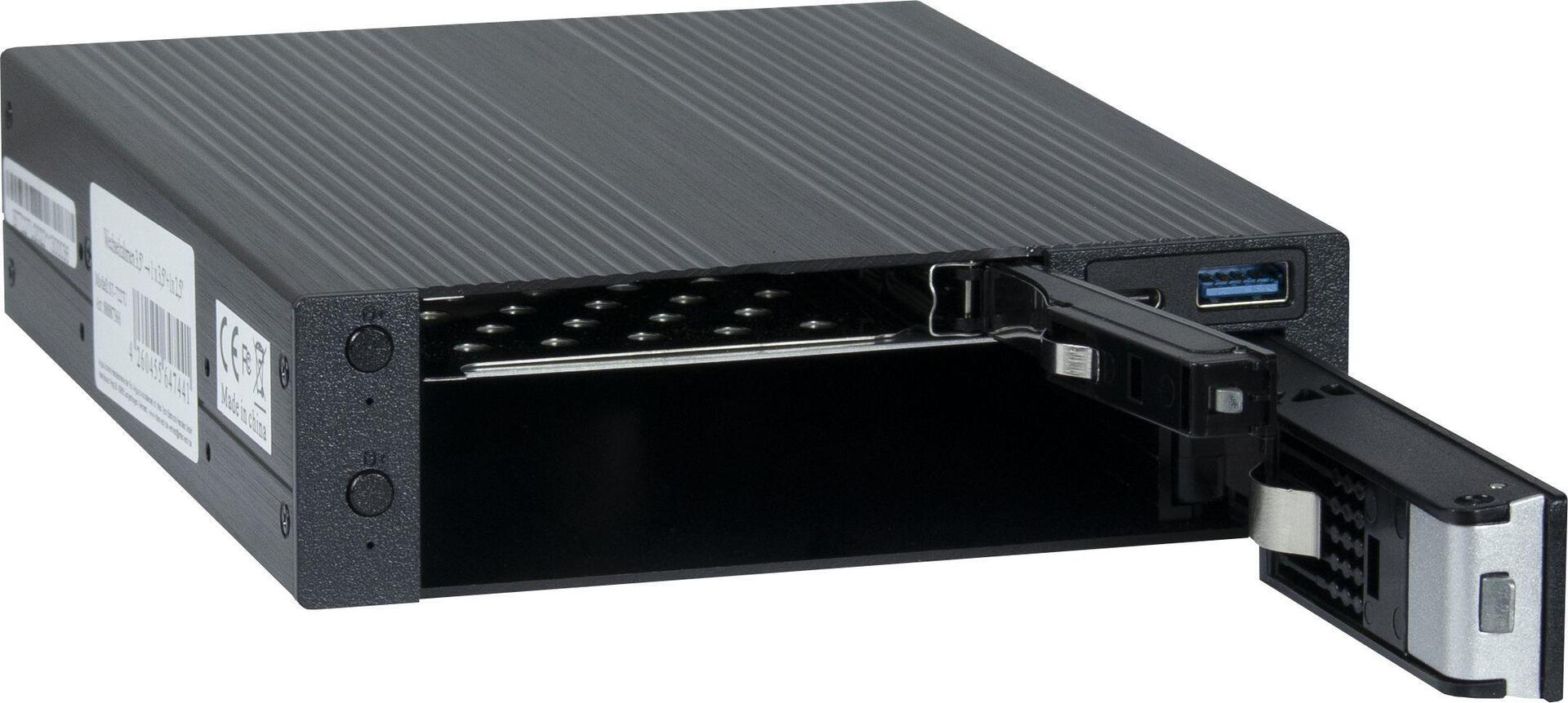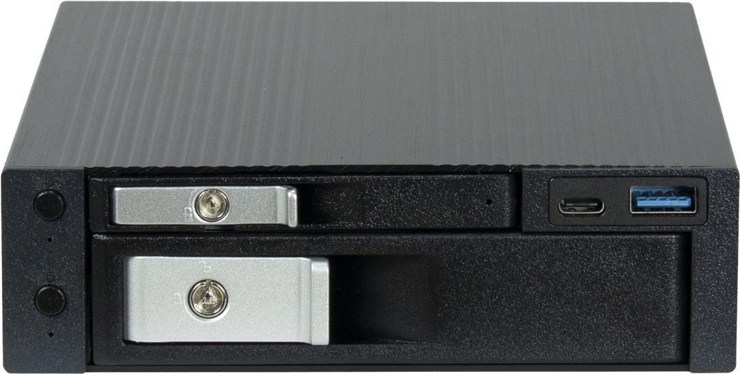 Kleines abschließbares Hot-Swap-Gerät, das eine 2,5\"- und eine 3,5\"-Festplatte für den zusätzlichen Einbau in einen externen 5,25\"-Schacht unterstützt.Sie können die Festplatten direkt in das Gerät einsetzen, ohne einen zusätzlichen Einbaurahmen zu verwenden. Beim Öffnen des Geräts schiebt ein intelligenter Mechanismus die Festplatte heraus, um sie leicht zu entfernen.Ein USB-Typ-C- und ein USB-Typ-A-Anschluss, die beide USB 3.2 Gen1 unterstützen, vervollständigen dieses Gerät.