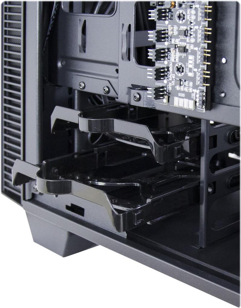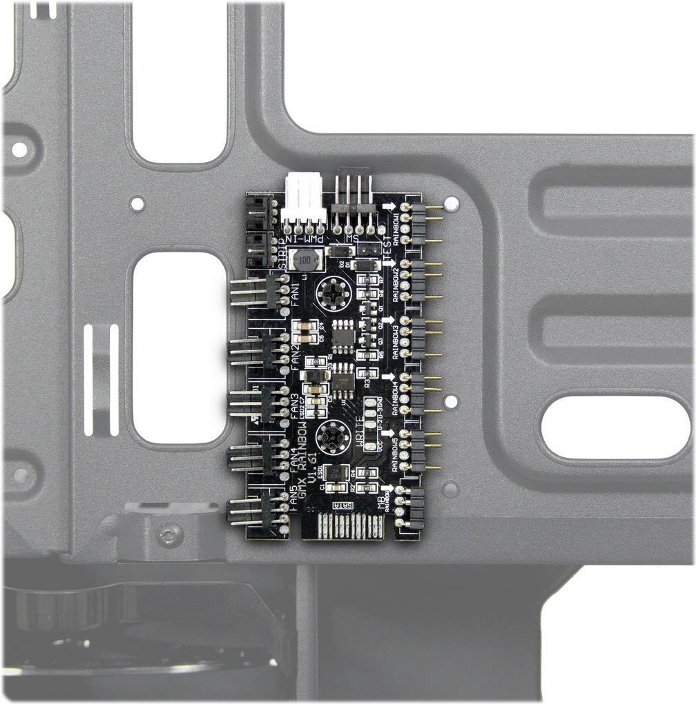 Auf dem Deckel des Gehäuses befinden sich ein abnehmbarer Staubfilter sowie die Bedienelemente. Neben den HD-Audio Buchsen gibt es je einen USB 3.0 Type A und USB 3.0 Type C Anschluss sowie zwei separate Schalter zum Steuern der Helligkeit und der Effekte. Ein Staubfilter im Netzteiltunnel sowie Silentblöcke, auf denen das Netzteil lagert, erlauben einen leisen und sauberen Betrieb. Mit herausnehmbaren Festplatteneinbaurahmen, einer Halterung für lange Grafikkarten, dem beiliegenden RGB Sync-Kabel sowie vielfältigen Verlegemöglichkeiten für Kabel lässt das X-608 kaum Wünsche offen.