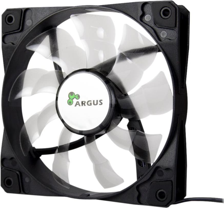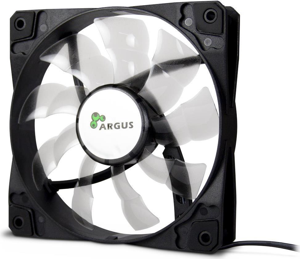 Die laufruhigen 120 mm LED-Lüfter von Argus bieten mit ihren 33 ultrahellen LEDs einen stylischen Spiraleffekt und leuchten zudem noch satt den Innenraum des Gehäuses aus.Gummierte Auflagen in den Lüfterecken, auf beiden Seiten des Lüfters, sorgen für einen vibrationsfreien Betrieb und lassen die Option offen, ob der Lüfter kühle Luft ansaugen oder warme Luft aus dem Gehäuse pusten soll.Produkttext[/head]Der laufruhige 120mm Lüfter von Argus sorgt mit seinen gummierten Auflagen in den Lüfterecken, auf beiden Seiten des Lüfters, für einen vibrationsfreien Betrieb und lässt so die Option offen, ob der Lüfter kühle Luft ansaugen oder die warme Luft aus dem Gehäuse pusten soll.Der Anschluss erfolgt wahlweise über einen 3Pin Anschluss am Mainboard oder einen 4Pin Molex-Anschluss direkt am Netzteil.[head]Hauptmerkmale