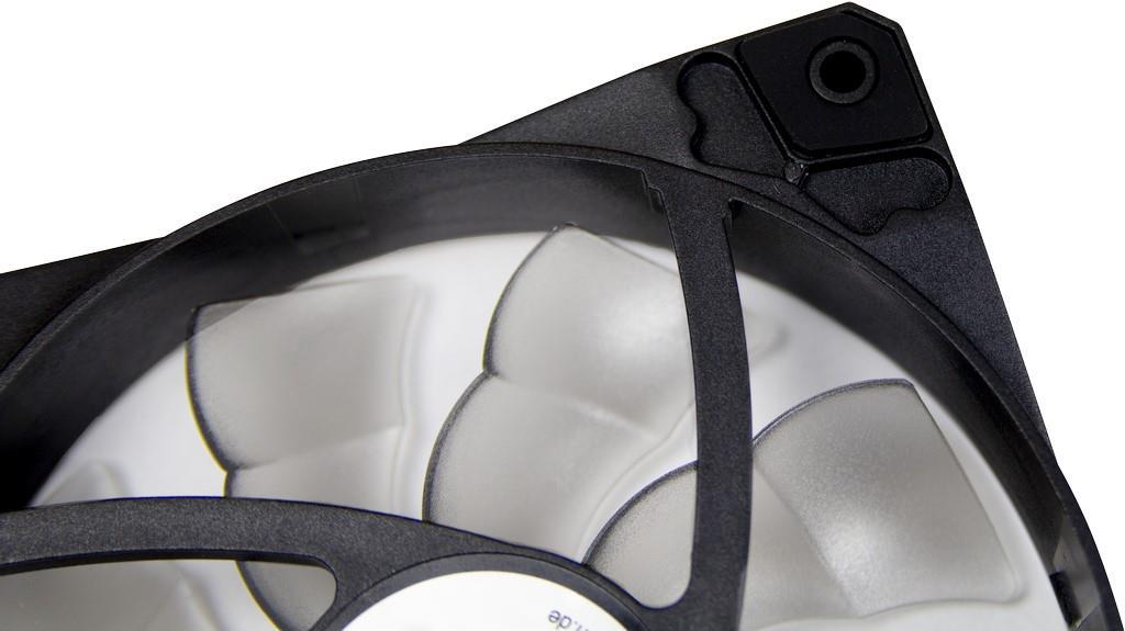 Gummierte Auflagen in den Lüfterecken, auf beiden Seiten des Lüfters, sorgen für einen vibrationsfreien Betrieb und lassen die Option offen, ob der Lüfter kühle Luft ansaugen oder warme Luft aus dem Gehäuse pusten soll.