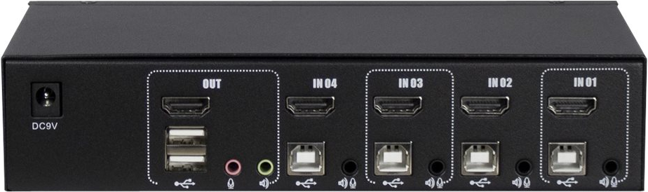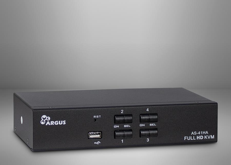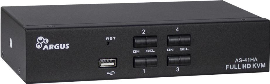 Der Anschluss des KVM erfolgt per USB (Tastatur / Maus), 8x 3,5mm Klinke (Audio Mic/Line) und HDMI (HDMI-Monitor) über die vier mitgelieferten Anschlusskabel, an die Computer.Über den zusätzlichen USB-Port in der Front lassen sich zudem externe Datenträger, wie z.B. USB-Sticks, anschließen und verwalten.Produkttext[/head]Der KVM AS-41HA HDMI ist ein günstiger 4-Port KVM-Switch mit automatischem Audioumschalter für den Desktopbereich.Der Anschluss des KVM erfolgt per USB (Tastatur / Maus), 8x 3,5mm Klinke (Audio Mic/Line) und HDMI (HDMI-Monitor) über die vier mitgelieferten Anschlusskabel, an die Computer.Über den zusätzlichen USB-Port in der Front lassen sich zudem externe Datenträger, wie z.B. USB-Sticks, anschließen und verwalten.[head]Hauptmerkmale