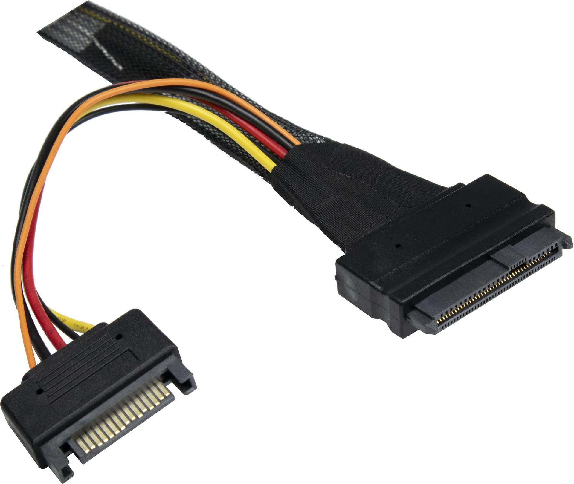 Ausgestattet mit einem OCuLink (SFF-8611)-Anschluss auf der linken Seite und zwei Anschlüssen auf der rechten Seite, darunter ein 15-poliger Serial ATA-Stromanschluss und ein U.2 (SFF-8639)-Anschluss, ist dieses Kabel für verschiedene Konfigurationen geeignet. Es eignet sich ideal für Rechenzentren und professionelle Setups, vereinfacht die Verbindungen zwischen Ihren SAS- und SATA-Systemen und gewährleistet gleichzeitig eine sichere Verbindung für Ihre Speicheranforderungen.