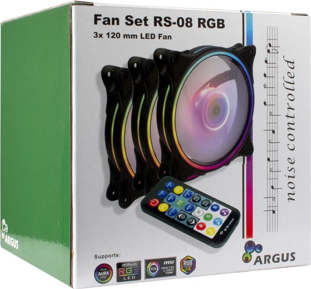 Das Argus RGB-Fan Set RS-08 macht Ihre Welt bunter! Das in der Steuerungseinheit integrierte Mikrofon reagiert empfindlich auf Umgebungsgeräusche, wie z. B. Musik, und ändert je nach Lautstärke die Effekte und Farben der angeschlossenen Lüfter.Die drei 120 mm RGB-Lüfter von Argus bieten eine tolle Beleuchtung für Ihr PC-Gehäuse und bieten mit der beiliegenden Funk-Fernbedienung und der Steuerungseinheit über 300 verschiedene Effekte und Modi. Zusätzlich bietet die Steuerungseinheit die Möglichkeit über ein integriertes Mikrofon, z. B. durch Musik oder Geräusche, die Effekte zu steuern. Wem das nicht ausreicht, kann zudem über den integrierten 5V RGB-Header (adressierbare RGB-LEDs), alle RGB-LEDs synchron über das Mainboard verwalten und steuern.Die jeweils 24 integrierten RGB-LEDs pro 120 mm Lüfter sind der Garant für außergewöhnliche Lichteffekte. Gummierte Auflagen unterhalb der Befestigungslöcher verhindern bei den Lüftern zuverlässig die Übertragung von Vibrationen auf das PC-Gehäuse und sorgen für einen laufruhigen Betrieb bei bis zu 1200 U/min und max. 30 dBA.