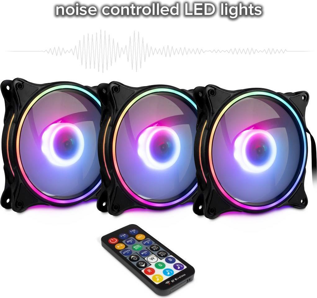 Das Argus RGB-Fan Set RS-08 macht Ihre Welt bunter! Das in der Steuerungseinheit integrierte Mikrofon reagiert empfindlich auf Umgebungsgeräusche, wie z. B. Musik, und ändert je nach Lautstärke die Effekte und Farben der angeschlossenen Lüfter. Die drei 120 mm RGB-Lüfter von Argus bieten eine tolle Beleuchtung für Ihr PC-Gehäuse und bieten mit der beiliegenden Funk-Fernbedienung und der Steuerungseinheit über 300 verschiedene Effekte und Modi. Zusätzlich bietet die Steuerungseinheit die Möglichkeit über ein integriertes Mikrofon, z. B. durch Musik oder Geräusche, die Effekte zu steuern. Wem das nicht ausreicht, kann zudem über den integrierten 5V RGB-Header (adressierbare RGB-LEDs), alle RGB-LEDs synchron über das Mainboard verwalten und steuern. Die jeweils 24 integrierten RGB-LEDs pro 120 mm Lüfter sind der Garant für außergewöhnliche Lichteffekte. Gummierte Auflagen unterhalb der Befestigungslöcher verhindern bei den Lüftern zuverlässig die Übertragung von Vibrationen auf das PC-Gehäuse und sorgen für einen laufruhigen Betrieb bei bis zu 1200 U/min und max. 30 dBA.