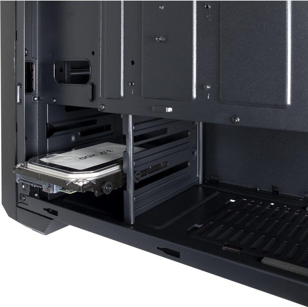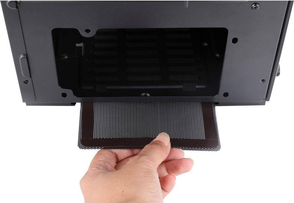 Im Deckel des Gehäuses befinden sich, neben den LED-Streifen, feste Staubfiltereinsätze sowie die Bedienelemente. Neben jeweils zwei USB 2.0 und 3.0 Anschlüssen sowie HD-Audio Buchsen, befinden sich dort ein Schieberegler zum Festlegen der Lüftergeschwindigkeit (Off/Low/High) sowie ein Schalter zum manuellen Durchschalten der LED-Effekte. Ein weiterer, herausnehmbarer Staubfilter unter dem Netzteil sowie vielfältige Möglichkeiten zum Verlegen der Kabel, komplettieren das Angebot.