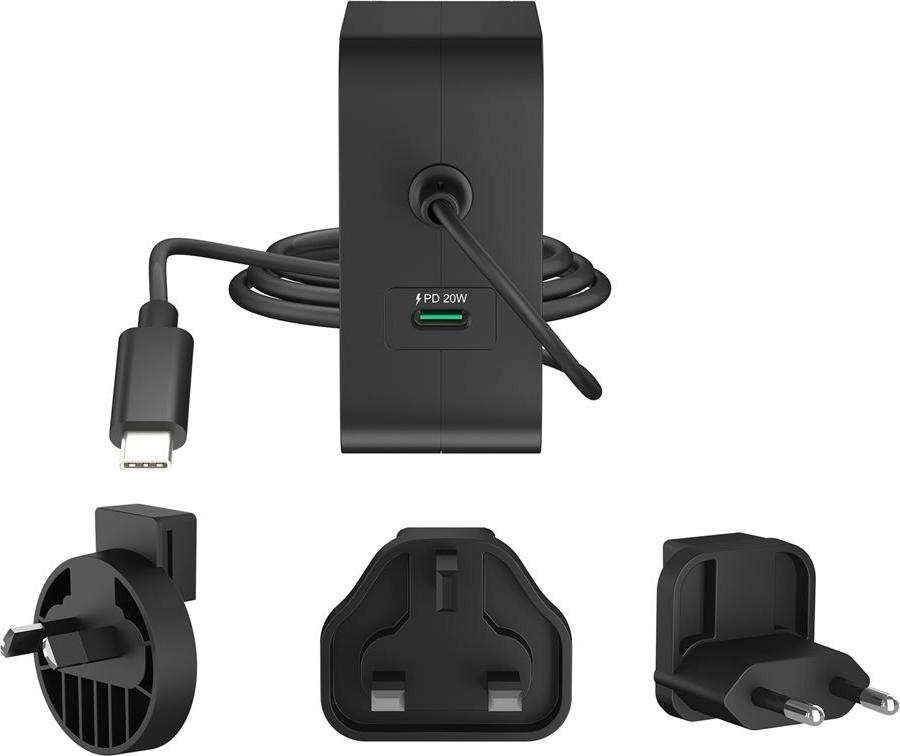 102-Watt-GaN-PD-USB-C -Reiseladegerät mit 2 Anschlüssen, einschließlich austauschbaren Netzsteckern, mit dem sich zwei Geräte gleichzeitig aufladen lassen. Dieses Ladegerät nutzt GaN-Technologie, sodass es eine beträchtliche Menge an Leistung in einem kleinen Gerät aufbieten kann. USB-C -Kabel und -Anschluss unterstützen beide Power Delivery 3.0-Technologie. Das nicht trennbare Kabel ist auf max. 100 Watt ausgelegt, sodass sich Laptops, Tablets und andere USB-C -Geräte mit den schnellstmöglichen Geschwindigkeiten aufladen lassen. Der USB-C -Anschluss liefert bis zu 20 Watt und eignet sich für das Laden von Mobiltelefonen. Durch Einsatz eines intelligenten IC wird bei gleichzeitiger Verwendung des USB-C -Kabels und des USB-C -Anschlusses die Leistung auf 82 Watt und 20 Watt, insgesamt 102 Watt, verteilt.
