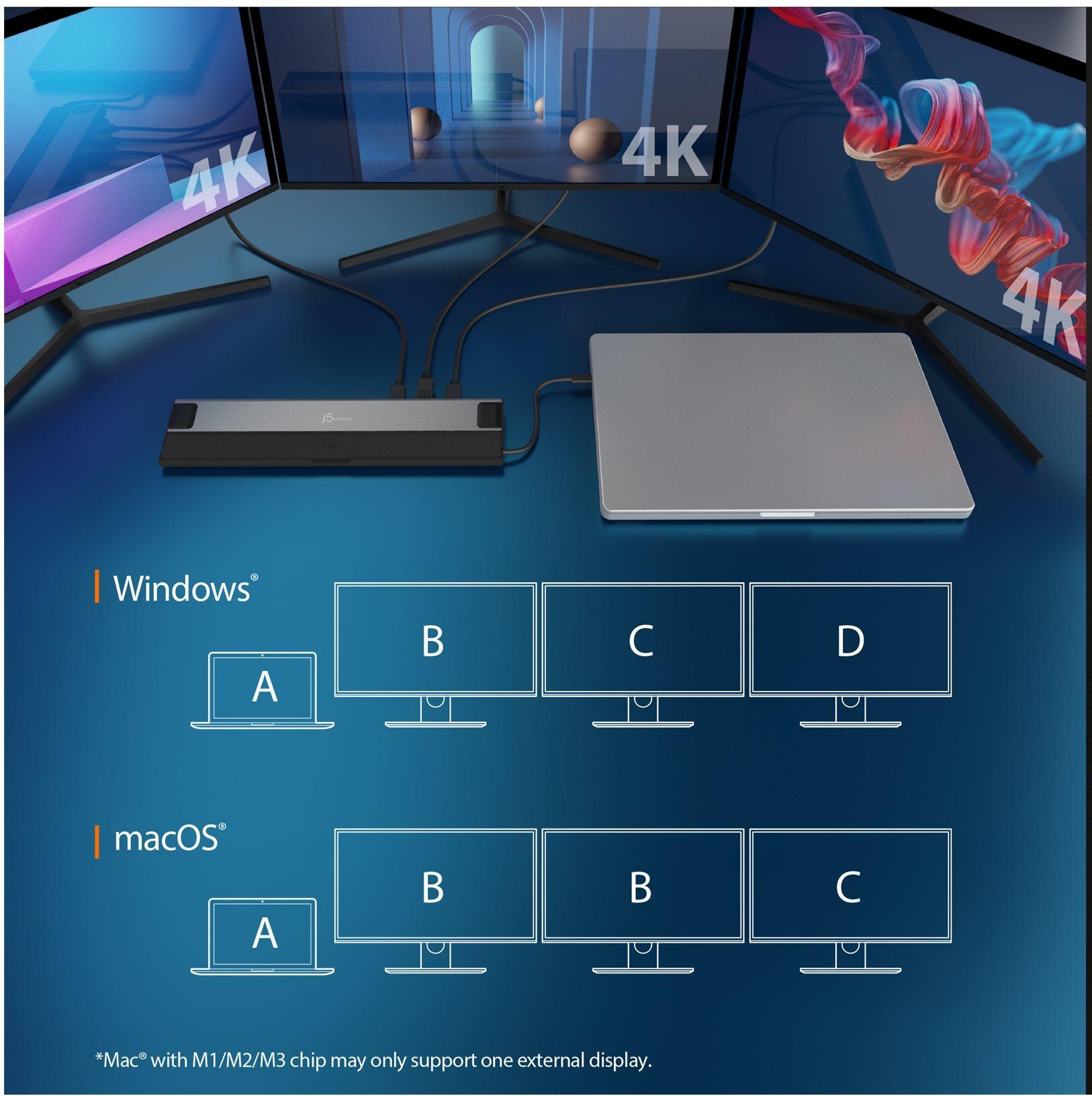 Diese leistungsstarke USB4 Triple 4K Display Dockingstation ist die erste USB-C Dockingstation, die einen USB4-Controller von Intel integriert und somit mit Thunderbolt 4 und USB4 Laptops kompatibel ist. Es ist keine Treiberinstallation erforderlich, was sie zu einer benutzerfreundlichen Dockingstation-Lösung macht. Mit einer Durchsatzrate von bis zu 40 Gbps und dynamischer Daten- und Displaybandbreitenzuweisung für einen effizienten Datenfluss können Sie problemlos ein Triple-Monitor-Setup mit bis zu 4K-Auflösung über DisplayPort, HDMI oder USB-C erstellen und Daten schneller abrufen, ohne die Systemleistung zu beeinträchtigen. Darüber hinaus verfügt sie über drei USB 3.2 10Gbps-Ports (1 USB-C und 2 Typ-A) zum Laden oder Anschliessen von Peripheriegeräten sowie über einen USB-C Power Delivery-Port, um Ihr Laptop aufzuladen und Ihre angeschlossenen Geräte mit bis zu 85W Durchgangsleistung zu versorgen. Ein USB 2.0-Port ist ebenfalls enthalten, um Ihre drahtlose USB-Maus oder -Tastatur mit reduzierter Latenz anzuschliessen.