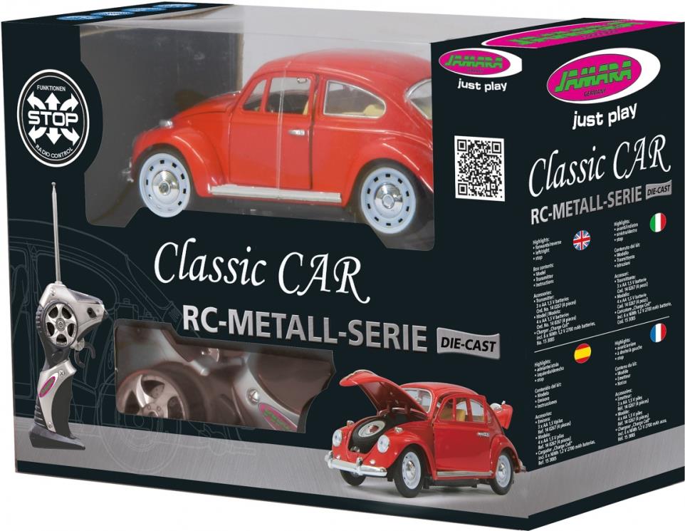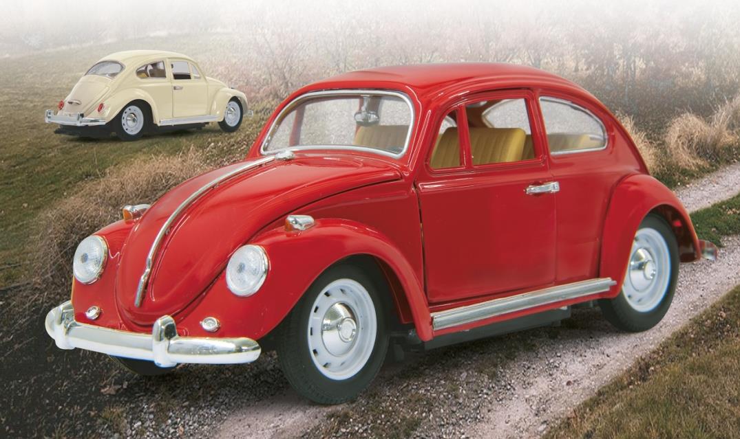 Erinnern Sie sich noch an den legendären VW Käfer? Jetzt können Sie sich und Ihren Kindern ihren Jugendtraum näherbringen. Mit hochwertigem Metallchassis und toller originalgetreuer Optik können Sie das Kultfahrzeug der 50er und 60er Jahre nochmal erleben. Und Beste ist mit der Fernsteuerung können sie den Käfer präzise über das Parkett steuern. Wenn er dann doch mal stehen sollte macht er nicht nur eine gute Figur als Sammlerstück sie können auch alle Türen und Klappen öffnen sogar die Motorhaube und die ist wie Kenner wissen, hinten. Ein Must-Have für Ihre RC-Car Sammlung. Für alle die hochwertiges Spielzeug lieben.