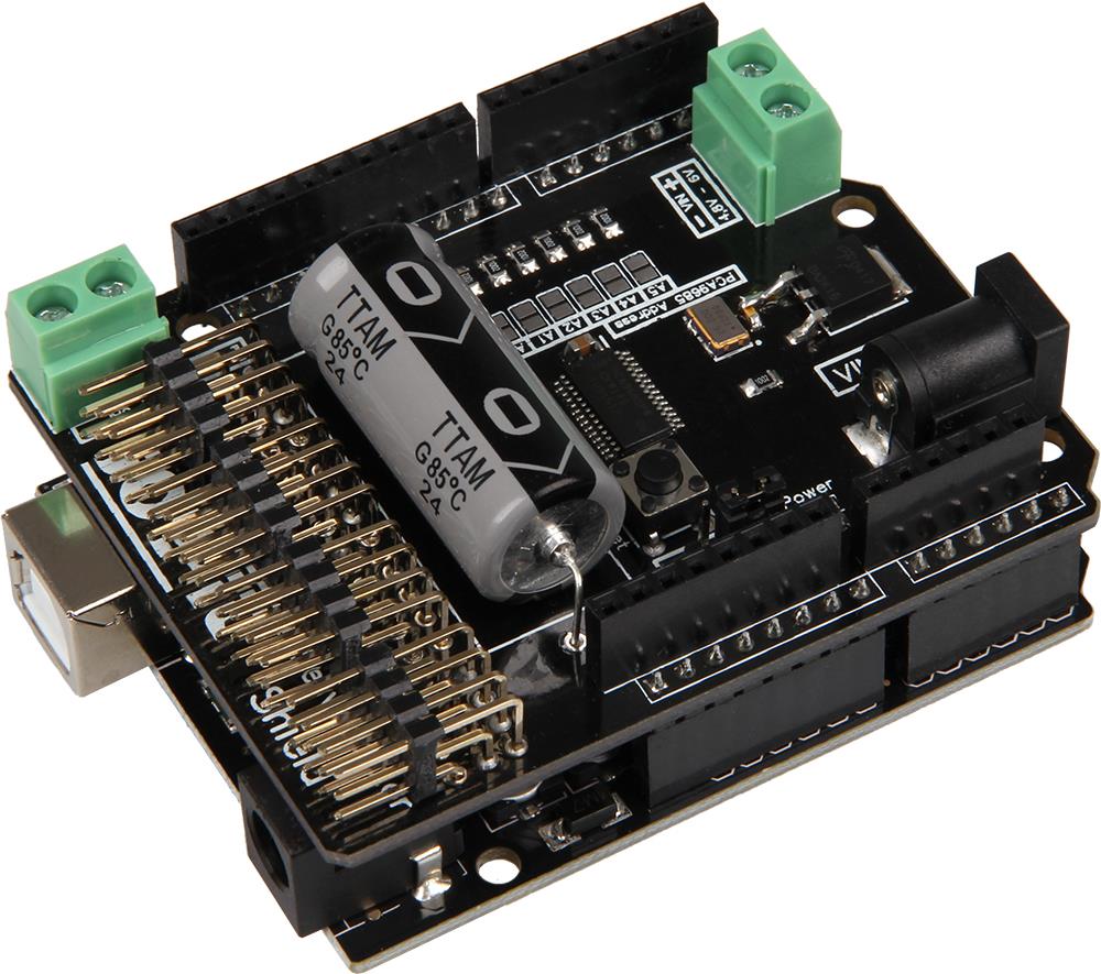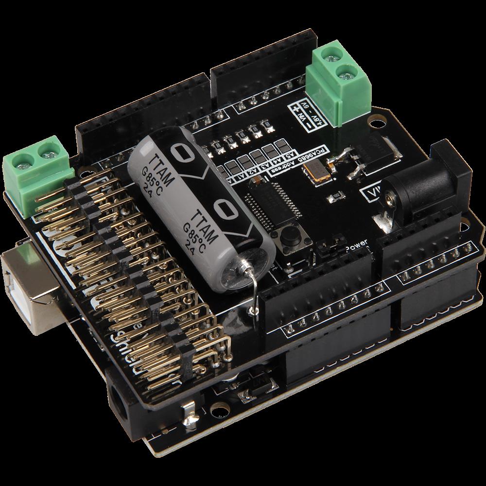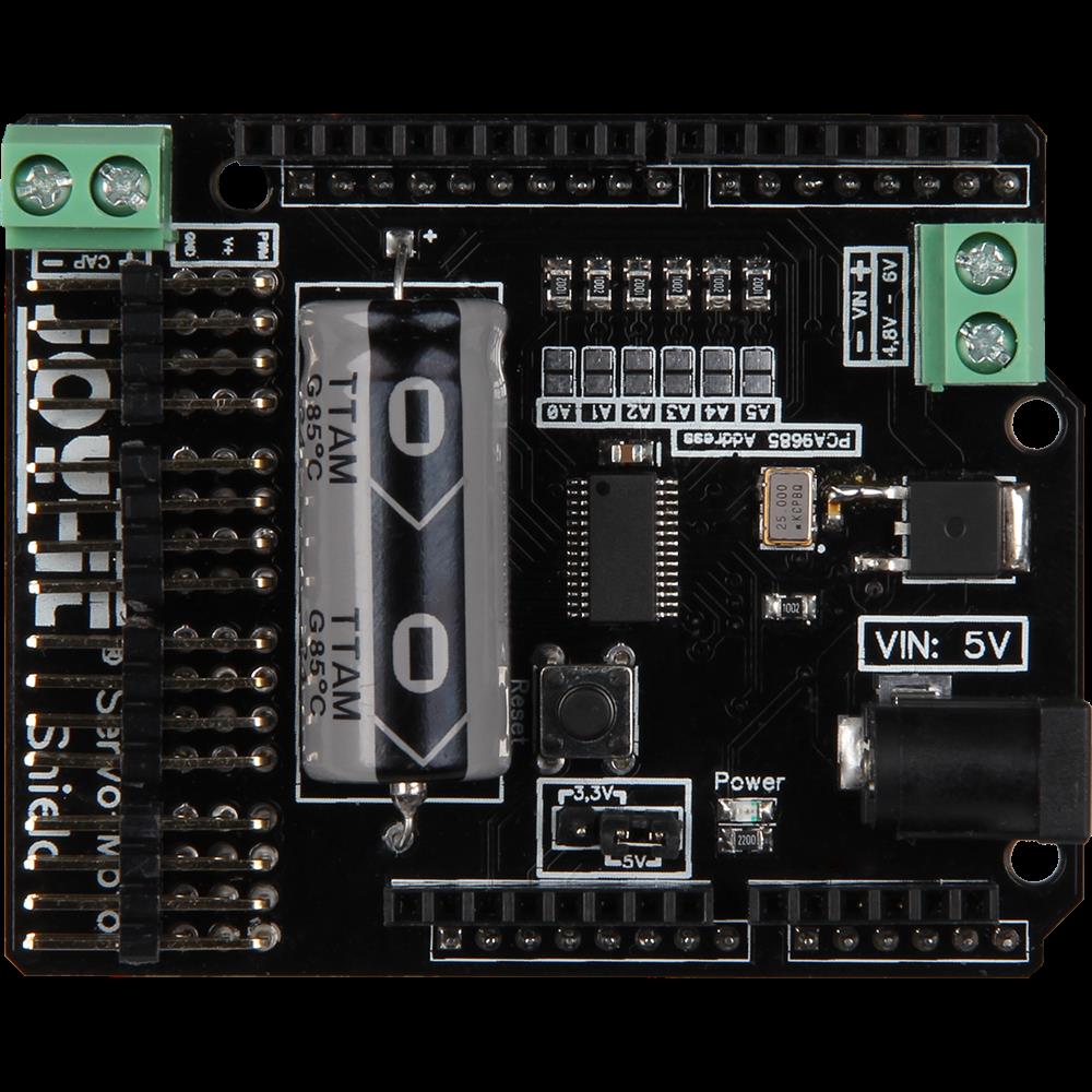 Dies ist eine Erweiterungsplatine zur Ansteuerung und Verwendung von bis zu 16 PWM-gesteuertern 5-Volt Servomotoren mit eigenem Taktgeber für genaue Positionierung durch ein genaues PWM-Signal. Sie bietet einzelne Spannungs- und Masse- und Steuerungsanschlüsse für jeden Motor und einen eingebauten Kondensator, welcher den Strom zusätzlich puffert. Die Platine hat 2 Spannungseingänge für 4,8 bis 6 Volt und bis zu 11 A. Direkt zum Aufstecken für kompatible Mikrocontroller Arduino MEGA2560 und Arduino Uno!