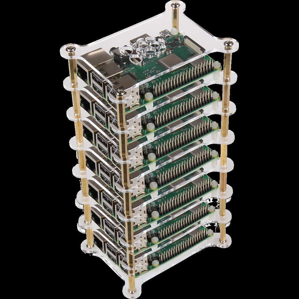 Der Maker Case Tower kann bis zu 7 Raspberrys oder andere Erweiterungsplatinen im Pi-Format aufnehmen. Er eignet sich unter anderem ideal um einen Servercluster zu bauen. Die Acrylplatten und Messing-Abstandshalter sind schnell und einfach montiert.
