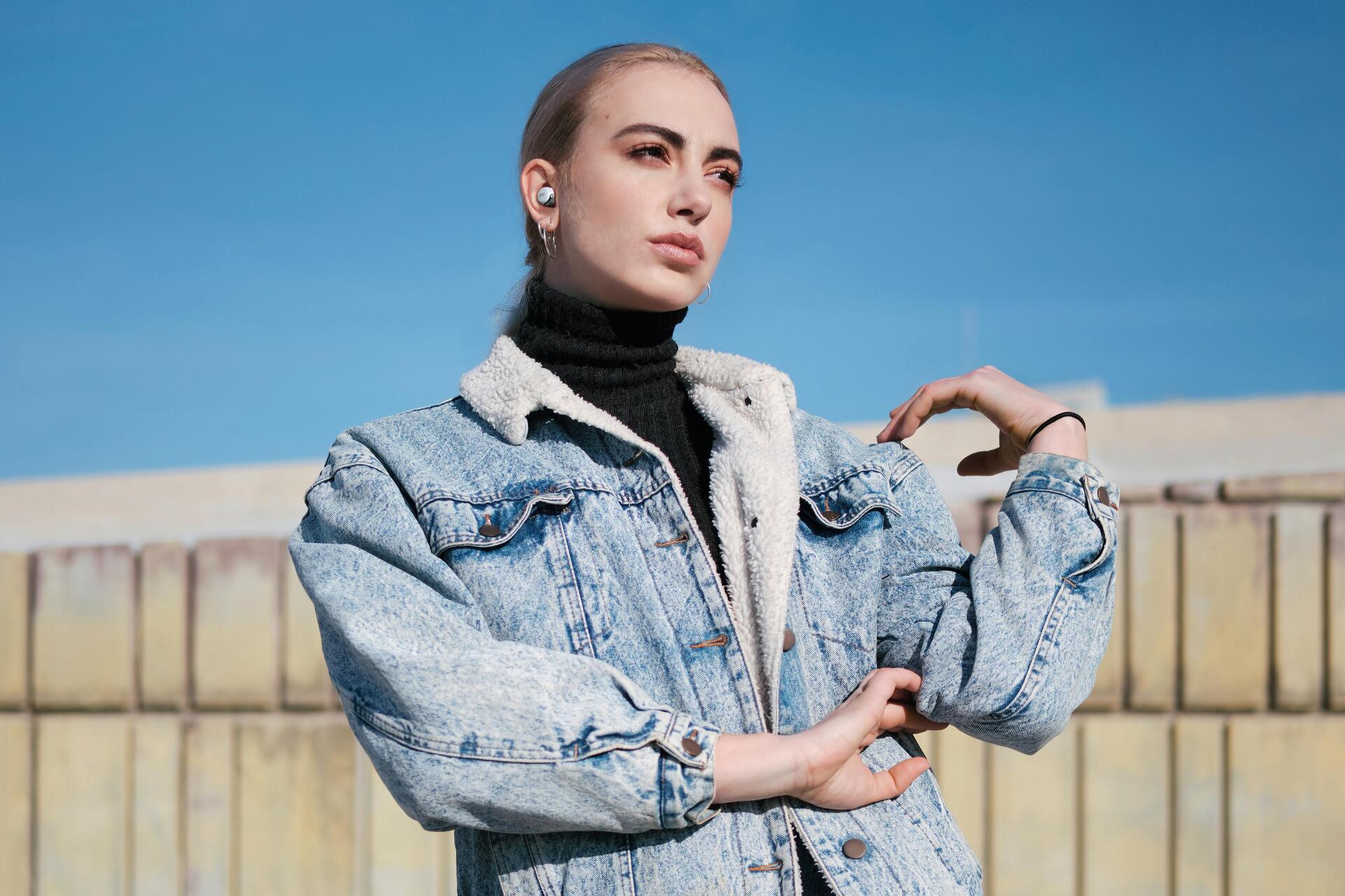 Kompakte, elegante, kabellose Ohrhörer mit Geräuschunterdrückung.