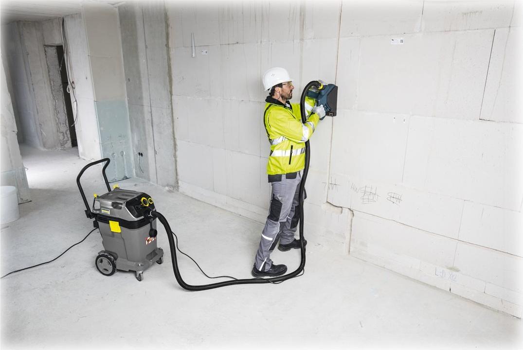 Dank der vollautomatischen Filterabreinigung schafft der Nass-/Trockensauger 50/1 Tact Te M unerreicht hohe Mengen Feinstaub bei gleichzeitig garantierter Filtrationseffizienz von 99,9 Prozent. Mittels sensorgesteuerter Elektronik sorgt das Gerät immer für eine optimale Filterabreinigung und damit für eine konstant hohe Saugleistung. Im Zusammenspiel mit dem großen und robusten 50-Liter-Behälter mit Metalllenkrollen und verstellbarem Schubbügel meistert das Gerät so auch sehr große Mengen gefährliche Feinstäube der Staubklasse M, aber auch Grobschmutz und Flüssigkeiten. Der NT 50/1 Tact Te M ist mit Gerätesteckdose mit Automatikanlauf sowie dem kompletten Antistatiksystem inklusive leitenden Zubehörs ausgestattet. Er eignet sich daher besonders für die Direktabsaugung an Elektrowerkzeugen, die viel Feinstaub produzieren.