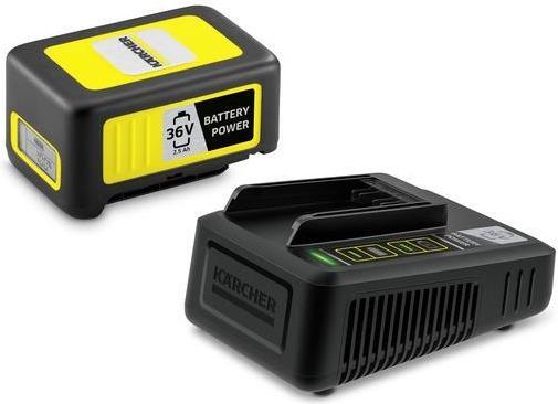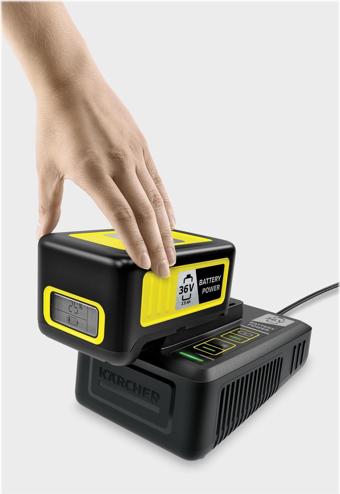 Ein Set für alle 36 V Kärcher Akkuplattformgeräte: das Starter Kit Kärcher Battery Power 36/25, bestehend aus einem 36 V / 2,5 Ah Kärcher Battery Power-Wechselakku mit innovativer Real Time Technology sowie einem 36-V-Schnellladegerät, das den Akku in nur 48 Minuten bis zu 80 Prozent auflädt.