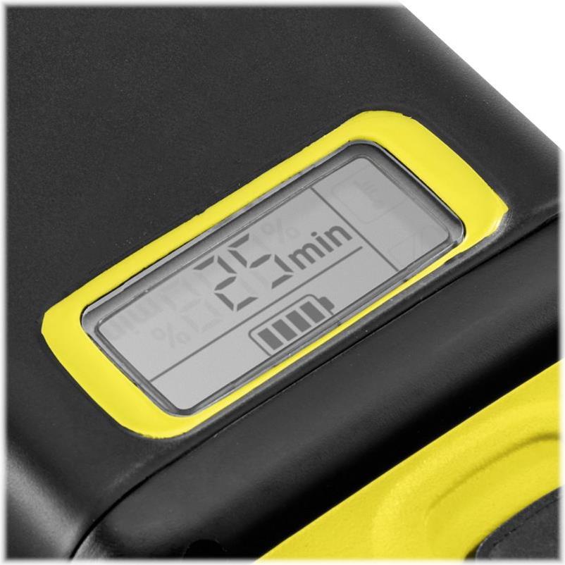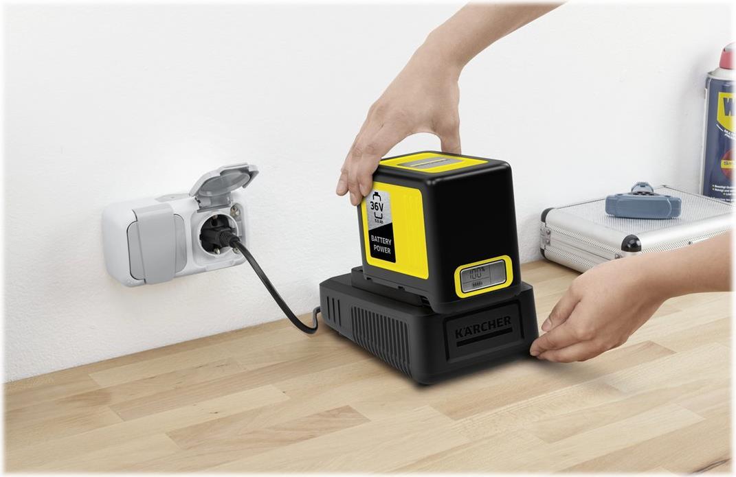 Das Schnellladegerät des Starter Kit Kärcher Battery Power 36/50 sorgt in nur 1,5 Stunden für 80 Prozent Akkuladung des 36 V / 5,0 Ah Kärcher Battery Power-Wechselakkus. Das Set eignet sich für den Einsatz in allen Geräten der 36 V Kärcher Akkuplattform.