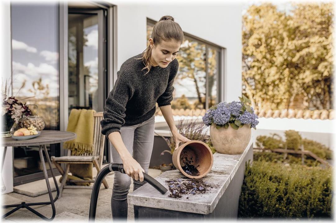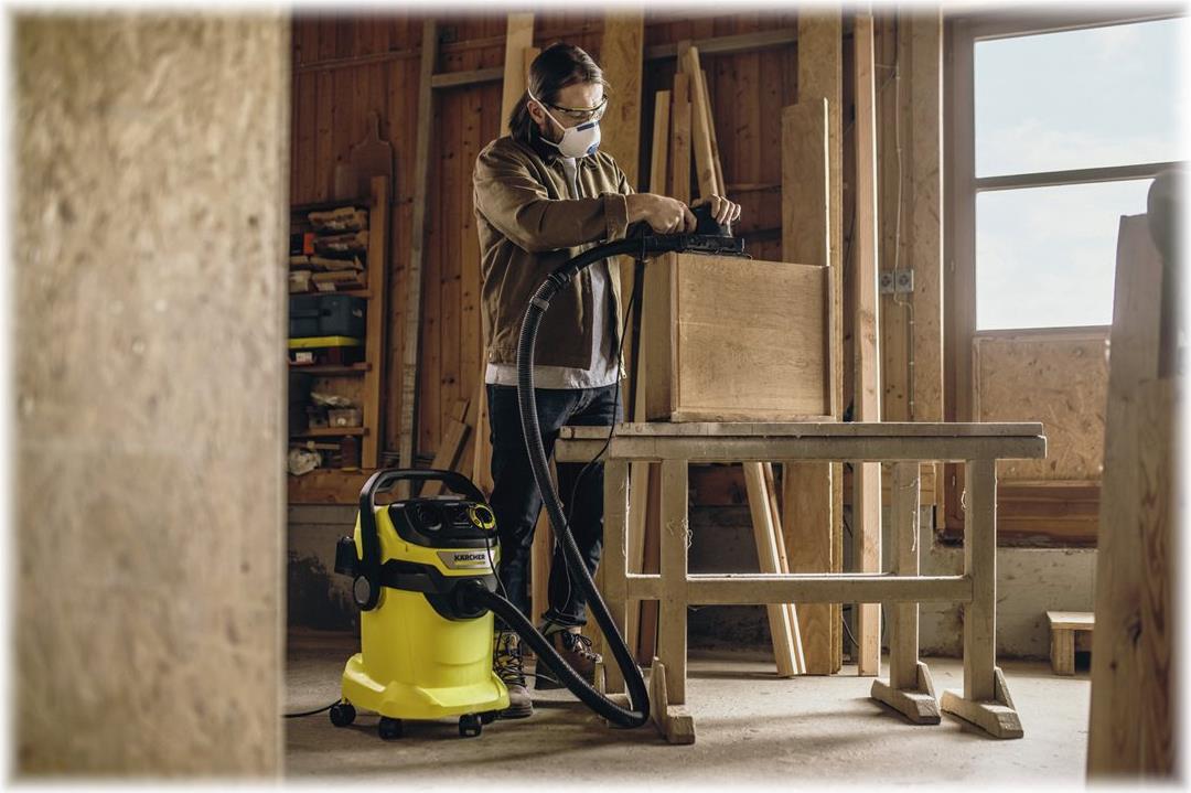 Der Nass-/Trockensauger WD 5 P V-25/5/22 mit 1100 Watt Stromverbrauch erreicht beste Reinigungsergebnisse, sowohl bei trockenem und nassem als auch feinem oder grobem Schmutz. Das Gerät besitzt einen 25-Liter-Kunststoffbehälter, 5 m Kabel, einen 2,2 m langen Saugschlauch, eine umschaltbare Bodendüse, Flachfaltenfilter und Vliesfilterbeutel. Über die integrierte Steckdose mit Ein-/Ausschaltautomatik können Elektrowerkzeuge angeschlossen werden. Schmutz, der beim Sägen oder Schleifen entsteht, wird direkt abgesaugt. Mit dem Drehschalter kann die Saugleistung bedarfsgerecht eingestellt werden. Durch die patentierte Filterentnahmetechnik lässt sich der Flachfaltenfilter sekundenschnell ausbauen, ganz ohne Schmutzkontakt. Durch Drücken der Abreinigungstaste wird der Filter effizient gereinigt und die Saugleistung schnell wieder hergestellt.