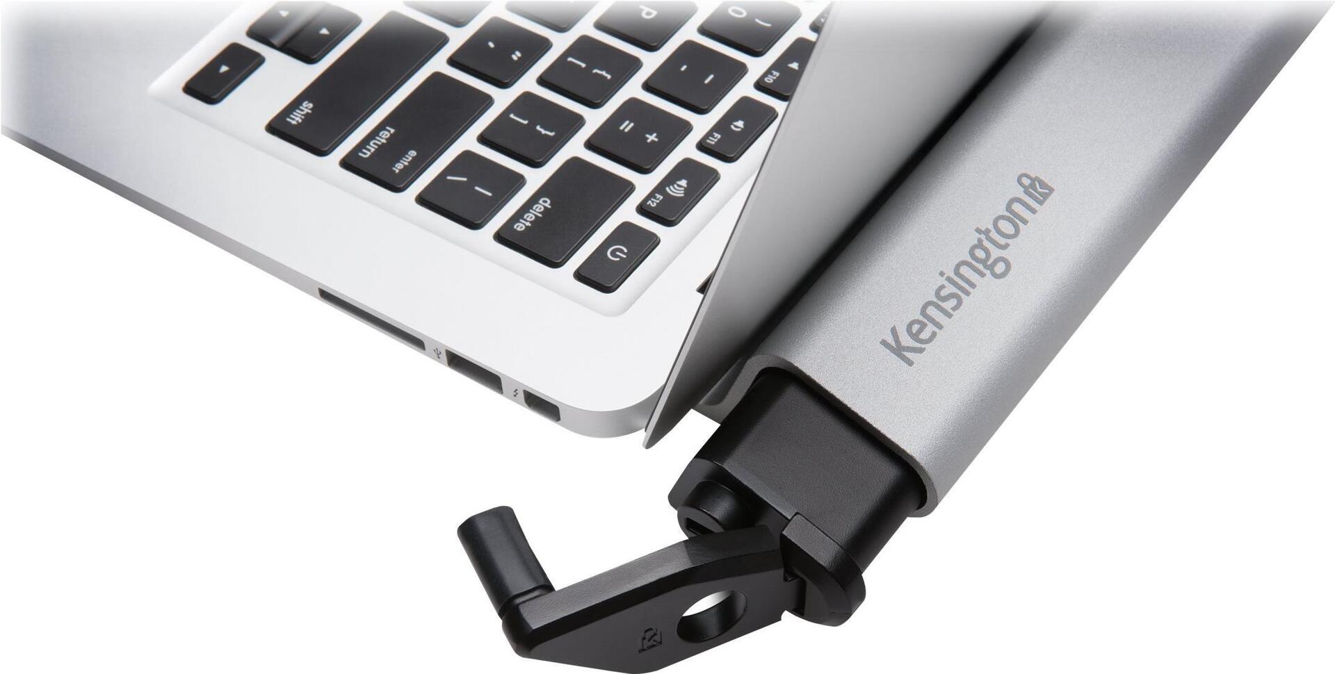 Design auf professionellem Niveau: Schlanke Locking Station aus gebürstetem Aluminium mit freiem Zugang zu seitlichen Anschlüssen und höchster Flexibilität beim Anbringen an den Laptop.