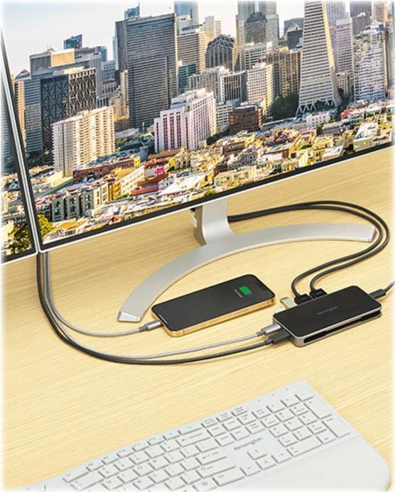 Unterwegs oder im Büro ist die UH1460P USB-C Mobile Dockingstation die ideale tragbare Dockingstation, um Ihre visuelle Produktivität auf bis zu 2 x HDMI-fähige Monitore zu erweitern. Diese treiberlose USB-C Dockingstation ist universell kompatibel und unterstützt Dual 4K @ 30 Hz Video und bis zu 85 W Power Pass-Through. Sie nutzt das USB-C-Netzteil des Laptops, um die Dockingstation mit Strom zu versorgen, während sie Ihr Laptop auflädt - das Mitführen eines zusätzlichen Netzteils entfällt. Das ultrakompakte 6-in-1-Design erweitert Ihre Produktivität mit 2 x USB-A 3.2 Gen1-Anschlüssen (5 Gbit/s/5V/1,5A), 1 x USB-C Gen1-Anschluss (5 Gbit/s/5V/1,5A) und 1 x Gigabit Ethernet-Anschluss. Diese Dockingstation passt problemlos in Ihren Rucksack oder Ihre Tragetasche, und das abnehmbare Kabel lässt sich für unterwegs verstauen. Mit der Unterstützung für Samsung DeX ermöglichen die USB-C Dockingstationen von Kensington ein computerähnliches Erlebnis für Samsung Galaxy-, Note- und Tab-Geräte. Auf 2 Jahre begrenzte Garantie.