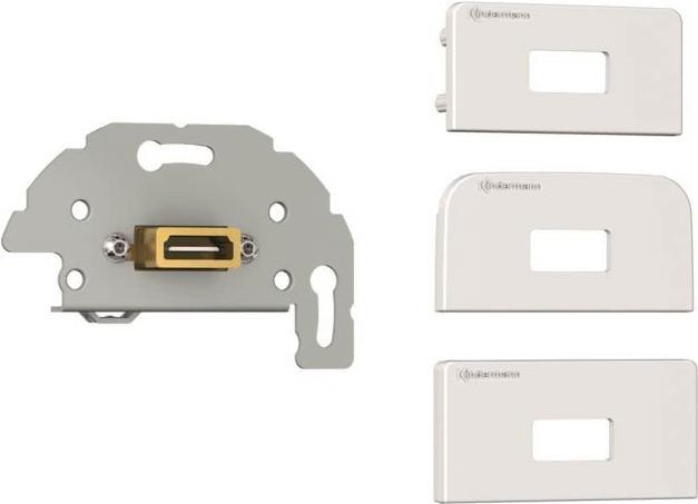 Anschlussblende mit Kabelpeitsche HDMI auf 19-Pin, Halbblende, RAL 9010 weiß, Frontabdeckung aus Kunststoff in den Größen 50 x 25, 54 x 27, 55 x 28mm im Lieferumfang.