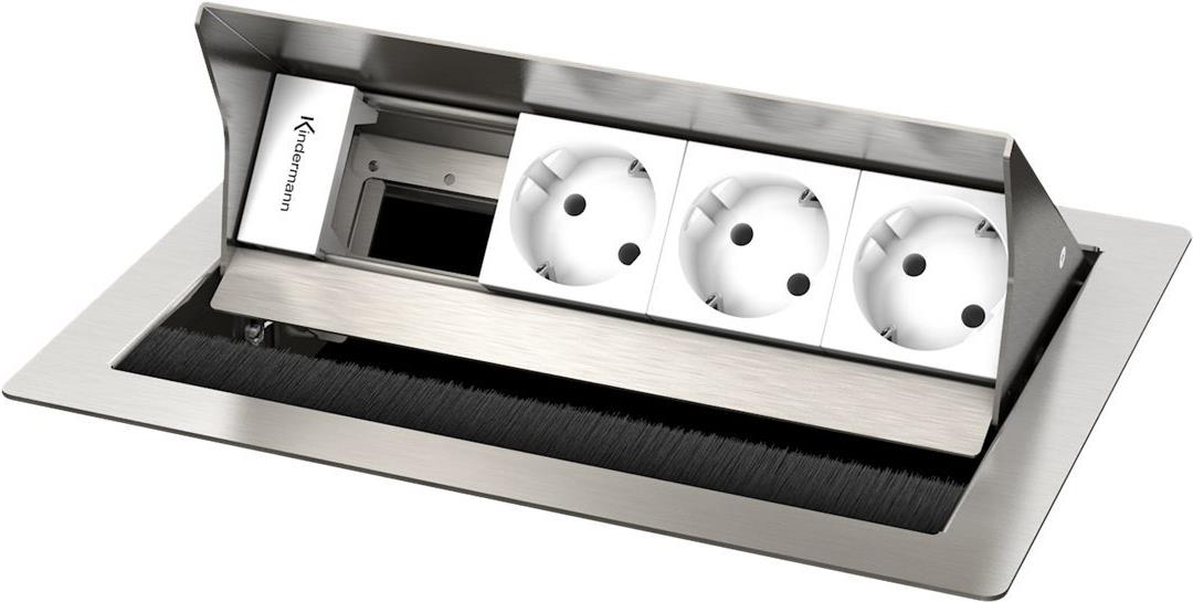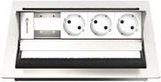 Tischeinbaugehäuse, Leermodul mit 3 x Strom (Schuko), Edelstahl gebürstet, individuell bestückbar mit Konnect flex 45 click Blenden (7464000xxx).
