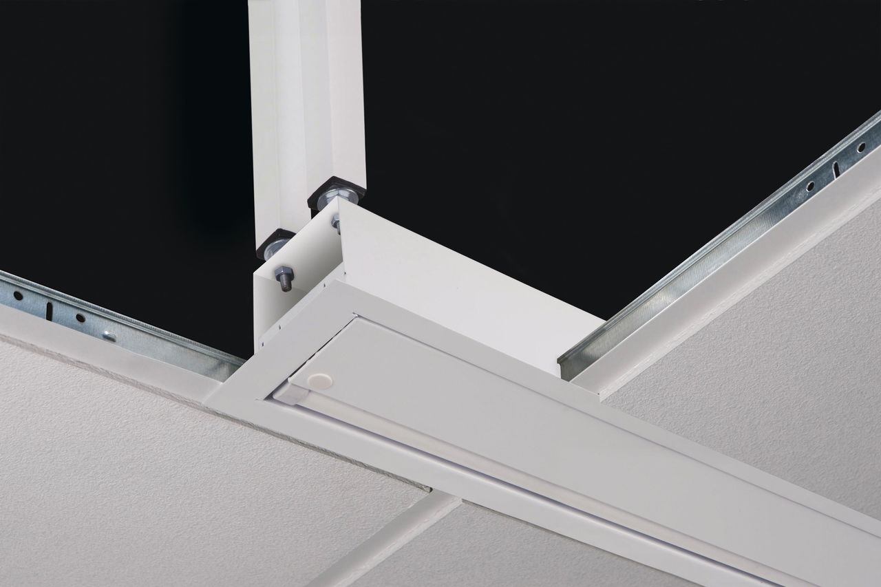 Der Abschluss durch den unteren Balken am Projektionstuch rt, dass die Deckenmontage unauffällig verläuft.