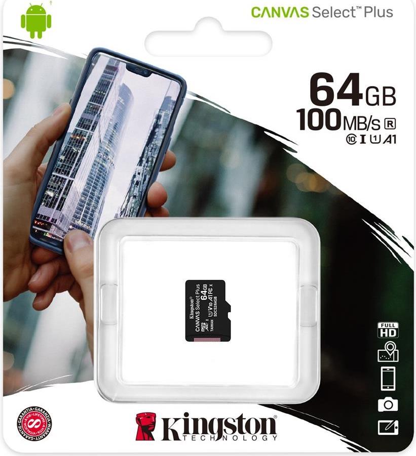 Die Kingston Canvas Select Plus microSD ist mit Android-Geräten kompatibel und verfügt über eine Leistung der Klasse A1. Sie bietet eine höhere Geschwindigkeit und Kapazität, um Apps schneller zu laden und scharfe Fotos und Videos aufzunehmen.Die leistungsstarke, schnelle und langlebige Canvas Select Plus microSD wurde für zuverlässige Aufnahmen und Entwicklungen von hochauflösenden Fotos sowie für das Filmen und Bearbeiten von Full HD-Videos entwickelt. Kingston Canvas Karten wurden in den rauesten Umgebungen und unter härtesten Bedingungen auf Langlebigkeit getestet und stellen damit sicher, dass Ihre Fotos, Videos und Dateien geschützt sind, wo auch immer Sie mit der Karte unterwegs sind.Produkttext[/head]Starke Leistung, Geschwindigkeit und Langlebigkeit.Die Kingston Canvas Select Plus microSD ist mit Android-Geräten kompatibel und verfügt über eine Leistung der Klasse A1. Sie bietet eine höhere Geschwindigkeit und Kapazität um Apps schneller zu laden und Fotos und Videos mit Kapazitäten bis 512GB* aufzunehmen. Die leistungsstarke, schnelle und langlebige Canvas Select Plus microSD wurde für zuverlässige Aufnahmen und Entwicklungen von hochauflösenden Fotos sowiw für das Filmen und Bearbeiten von Full-HD-Videos entwickelt. Kingston Canvas Karten wurden in den rauesten Umgebungen und unter härtesten Bedingungen auf Langlebigkeit getestet und stellen damit sicher, dass Ihre Fotos, Videos und Dateien geschützt sind, wo auch immer Sie mit der Karte unterwegs sind. Mit lebenslanger Garantie erhältlich. Geschwindigkeiten gemäß Klasse 10 UHS-I mit bis zu 100MB/s*Optimiert für Android-GeräteSpeicherkapazitäten bis zu 512GB**LanglebigLebenslange Garantie* Die Geschwindigkeit kann abhängig von Hardware, Software oder Nutzung variieren** Ein Teil der hier genannten Kapazität des Flashspeichers wird zur Formatierung oder für andere Funktionen genutzt und steht daher nicht zum Speichern von Daten zur Verfügung. Daher ist die tatsächlich zur Datenspeicherung verfügbare Speicherkapazität etwas niedriger als auf den Produkten angegeben. Weitere Informationen finden Sie im Flash Memory Guide von Kingston Technology unter kingston.com/flashguide.[head]Hauptmerkmale