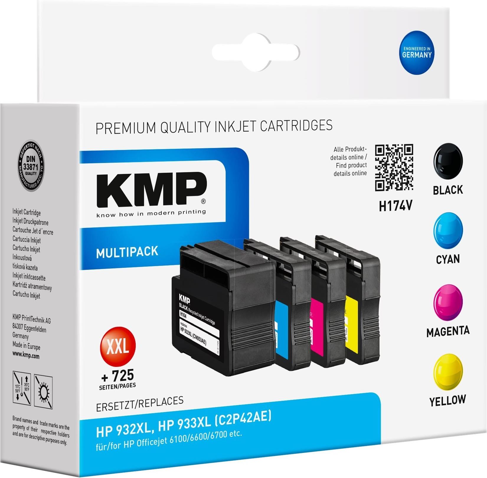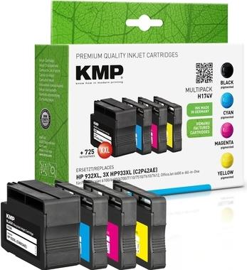 | Produktbeschreibung | KMP MULTIPACK H174V - 4er-Pack - Größe XXL - Schwarz, Gelb, Cyan, Magenta - kompatibel - Tintenpatrone (Alternative zu: HP 932XL, HP 933XL) |