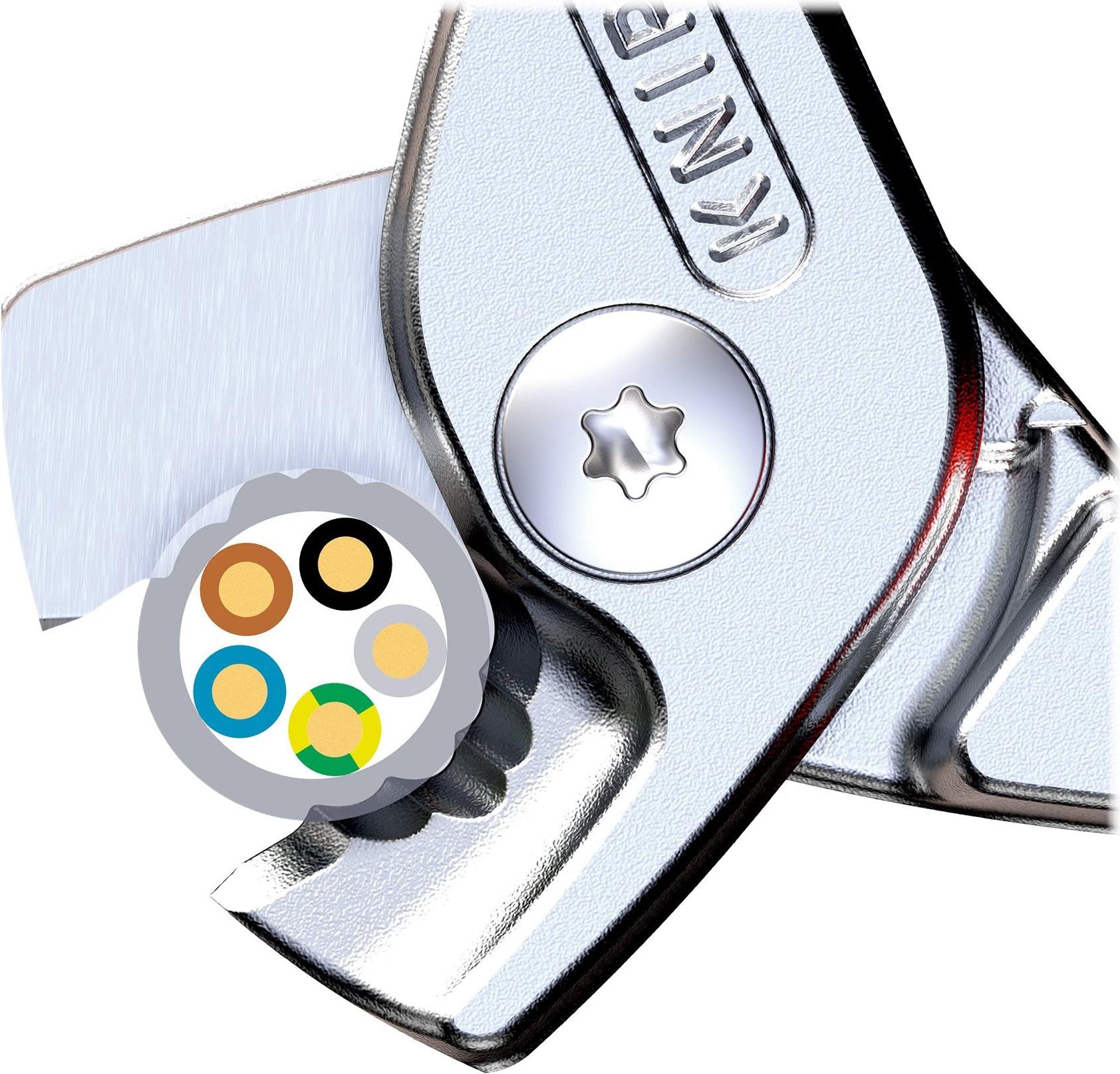 Eine gute Nachricht für alle Elektro-Profis: Die KNIPEX StepCut 95 11 160 schneidet mehradrige Leitungen erheblich leichter als Kabelscheren vergleichbarer Länge. Sie trennt Adern und Litzen nacheinander, was den Kraftaufwand um bis zu 40 Prozent reduziert! Das erlaubt der nur 16 Zentimeter langen Kabelschere überraschend hohe Kapazität: Sie trennt Ein- und Mehrleiterkabel aus Kupfer und Aluminium bis zu einem Durchmesser von 15 Millimeter (50 mm²), massive NYM-Kabel bis maximal 5 x 4 mm² leicht und präzise.