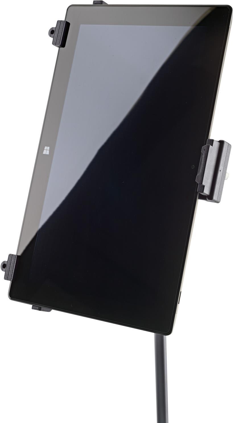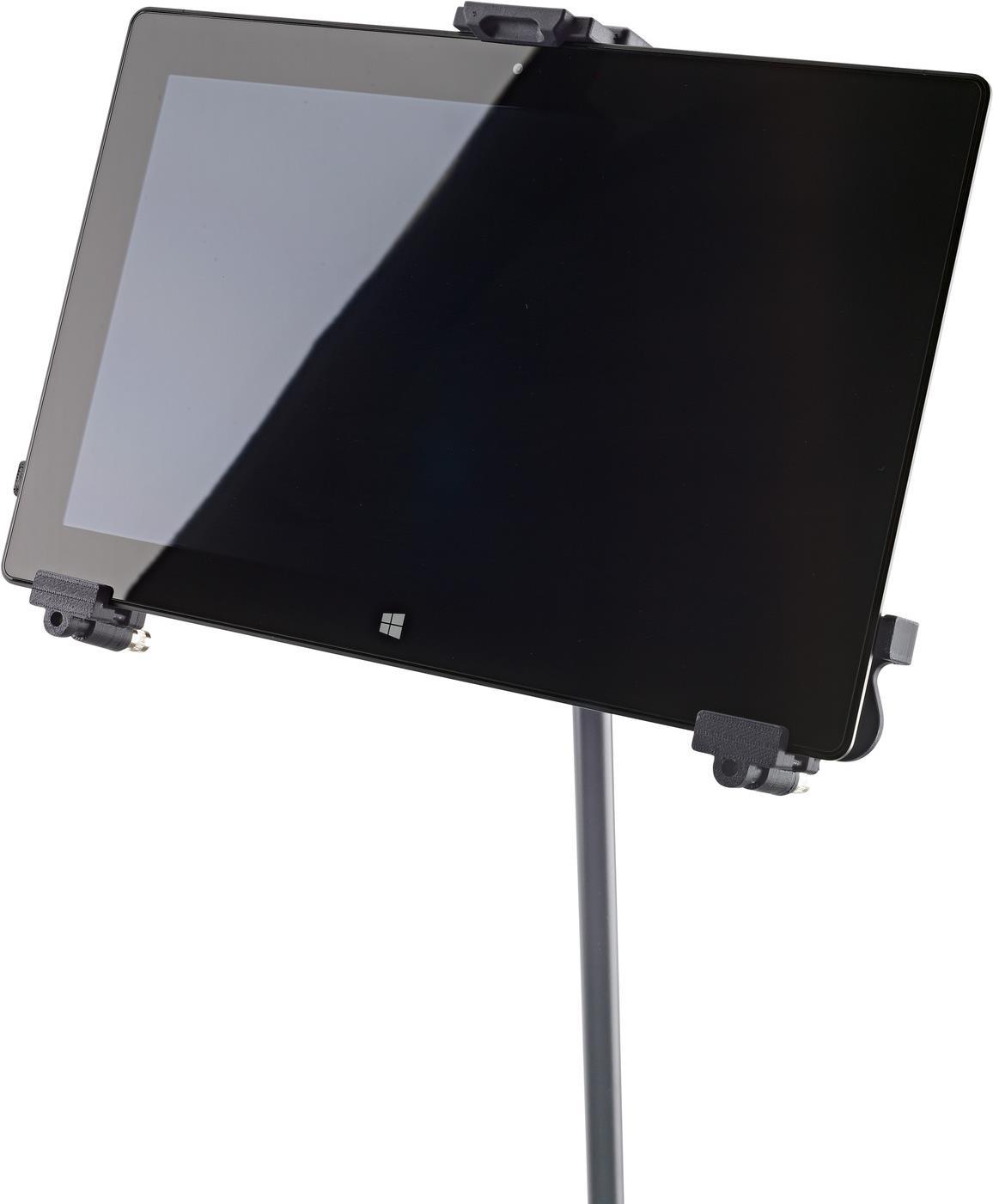 Tablet-Geräte fest im Griff: Die Universal-Tablet-Halterung ist stufenlos auf verschiedene Tablet-Größen ohne Werkzeug einstellbar und hält das Gerät garantiert sicher und effektvoll bei vielen Gelegenheiten. Egal ob auf der Bühne, im Proberaum oder zu Hause - dank des 3/8" Innengewindes kann der Halter beispielsweise auf jedes Mikrofonstativ schnell und einfach aufgeschraubt werden. Die individuell einstellbaren Haltearme ermöglichen den Einsatz von Tablets mit einer Höhe von 222 bis 334 mm und einer Breite von 128 bis 232 mm (wie z. B. iPad, iPad Air, iPad Pro, Amazon Fire HDX 8.9, Samsung Galaxy Tab ab 9.7, Google Nexus 9, Asus Transformer oder Microsoft Surface sowie Surface Pro). Die Tiefe des Tablets kann dabei zwischen 6 und 11 mm variieren. Beim erstmaligen Einstellen werden die drei Haltearme mittels Klemmschrauben auf die Größe und Tiefe des Tablets eingestellt. Für die weitere Nutzung wird das Tablet dann ganz einfach und schnell über einen Schnappverschluss eingesetzt und auch wieder entnommen. Dies sorgt für maximale Flexibilität und Bewegungsfreiheit. Eine handliche Flügelmutter ermöglicht die stufenlose Einstellung der Neigung, so dass jeder Anwender seine individuelle Position leicht finden kann. Das Tablet kann zwischen Hoch- und Querformat kurzerhand gedreht werden, wobei ein selbstständiges Drehen verhindert wird.