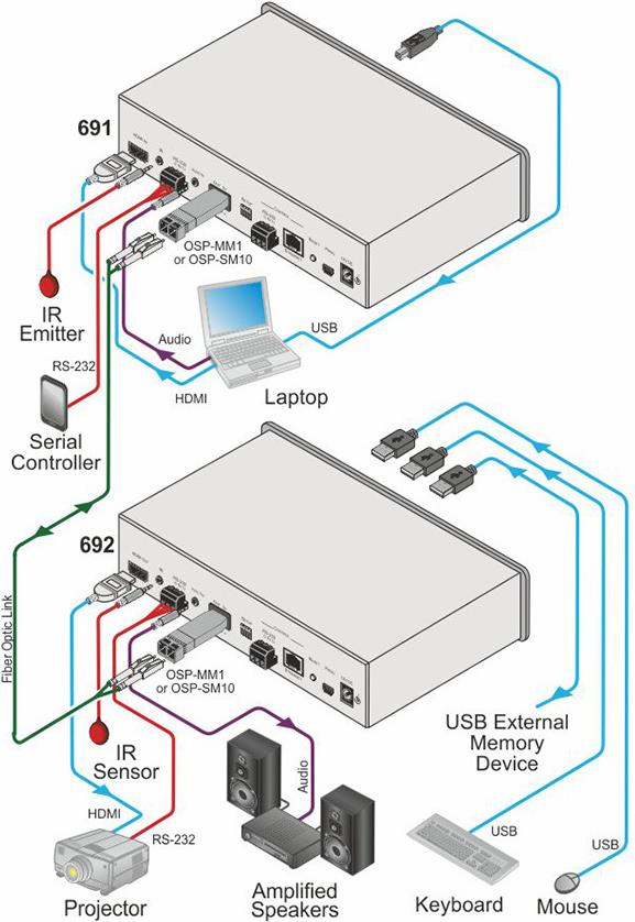 691 ist ein leistungsfähiger HDBaseT 2.0 LWL-Übertrager für Ultra-Reichweite von 4K 60 Hz (4:2:0) HDMI, USB, Ethernet, RS232, IR und Stereo-Audiosignalen über Multimode oder Singlemode Faseroptik. 691 wandelt alle Eingaben in das über Faseroptik übertragene HDBaseT 2.0 Signal. Der entfernte Empfänger wie z.B. Kramer 692, wandelt das HDBaseT 2.0 Signal zurück in 4K 60 Hz (4:2: 0) HDMI, USB 2.0, Ethernet, RS-232-, IR- und Stereo-Audio-Ausgangssignale. 691 überträgt Videosignale im Multi Mode bis 3 km und im Single Mode bis zu 33 km.