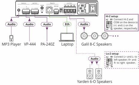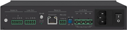 | Anschlüsse | Audio Line-In (Mini-Phone Stereo 3,5 mm) - Rückseite Ausgeglichener Audio-Input (Klemmleiste) - Rückseite Ausgeglichener Audio-Output (Klemmleiste) - Rückseite 2 x Lautsprecherausgang (Klemmleiste) - Rückseite Netzwerk (RJ-45) - Rückseite Seriell (Klemmleiste) - Rückseite |
