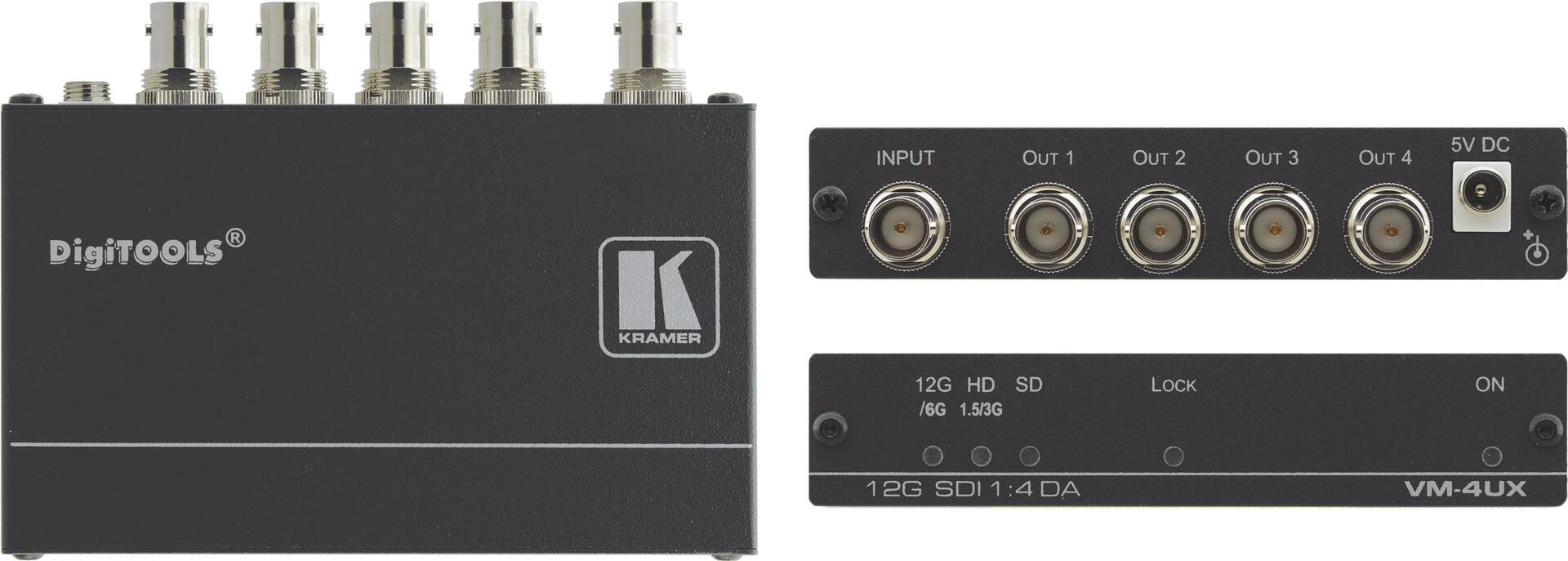 VM-4UX ist ein kompakter 1:4 Hochleistungs-Verteilverstärker für 4K Signale im Studio-Standard mit 12G Übertragungsrate. Er autoadaptiert die Datenrate des SDI-Eingangs, entzerrt und taktet das Signal neu für eine erhöhte Reichweite und verteilt das Signal an vier identische SDI-Ausgänge.