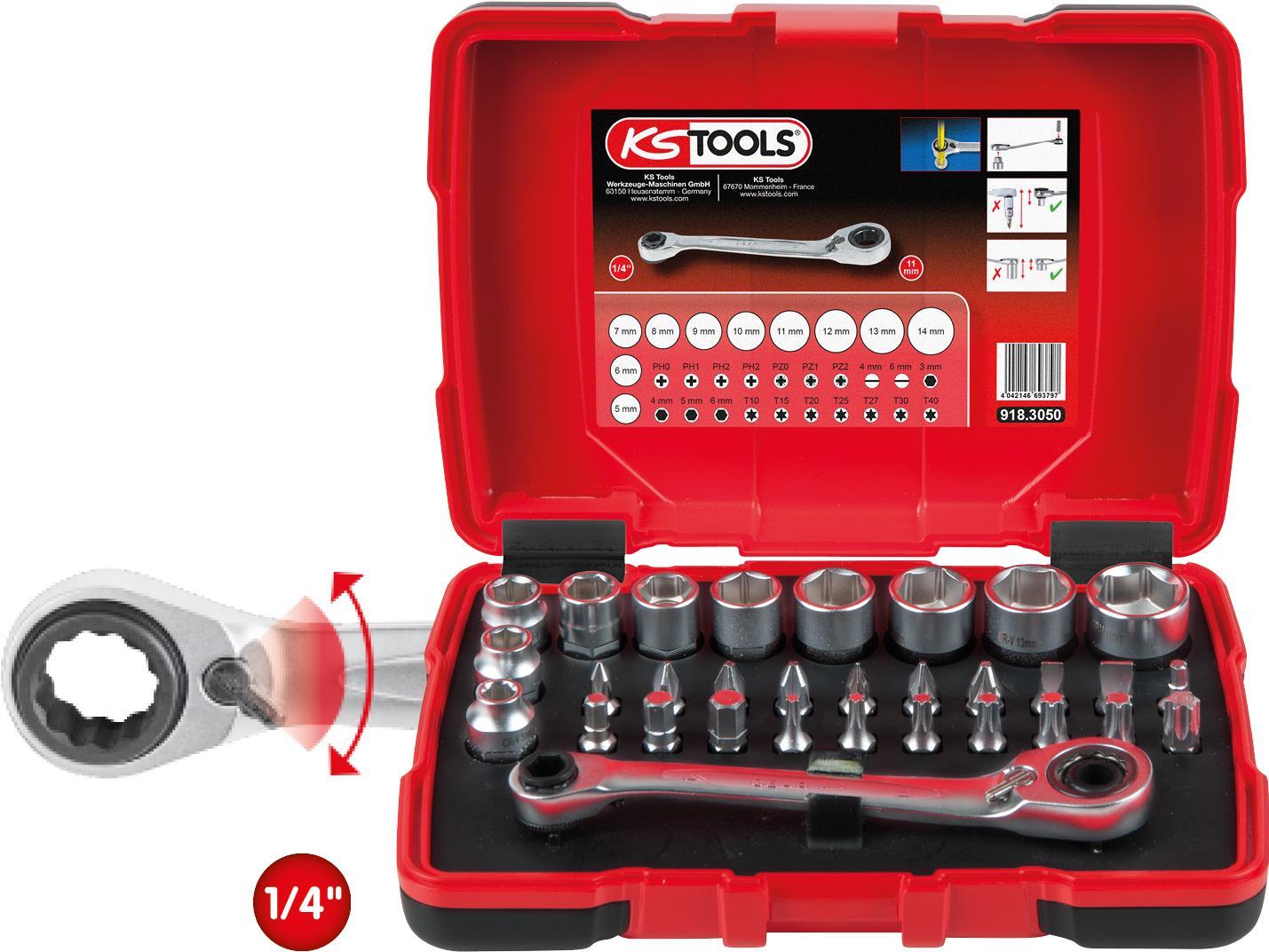 KS TOOLS 1/4" + 11 mm Durchgangs-Steckschlüssel- und Bit-Satz, 31-tlg. (918.3050)