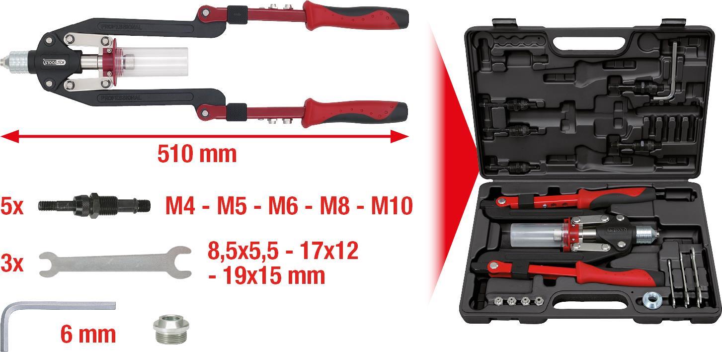 | Paketinhalt | 3 double open-ended wrenches - 5.5 + 8.5, 12 + 17, 15 + 19 mm, 5 riveting mouthpieces - 2.4, 3.2, 4, 4.8, 6.4 mm, collection container, nosepiece replacement rivet head, 5 rivet nuts - M4, M5, M6, M8, M10, riveting pliers - 510 mm, Inbusschlüssel - 6 mm |