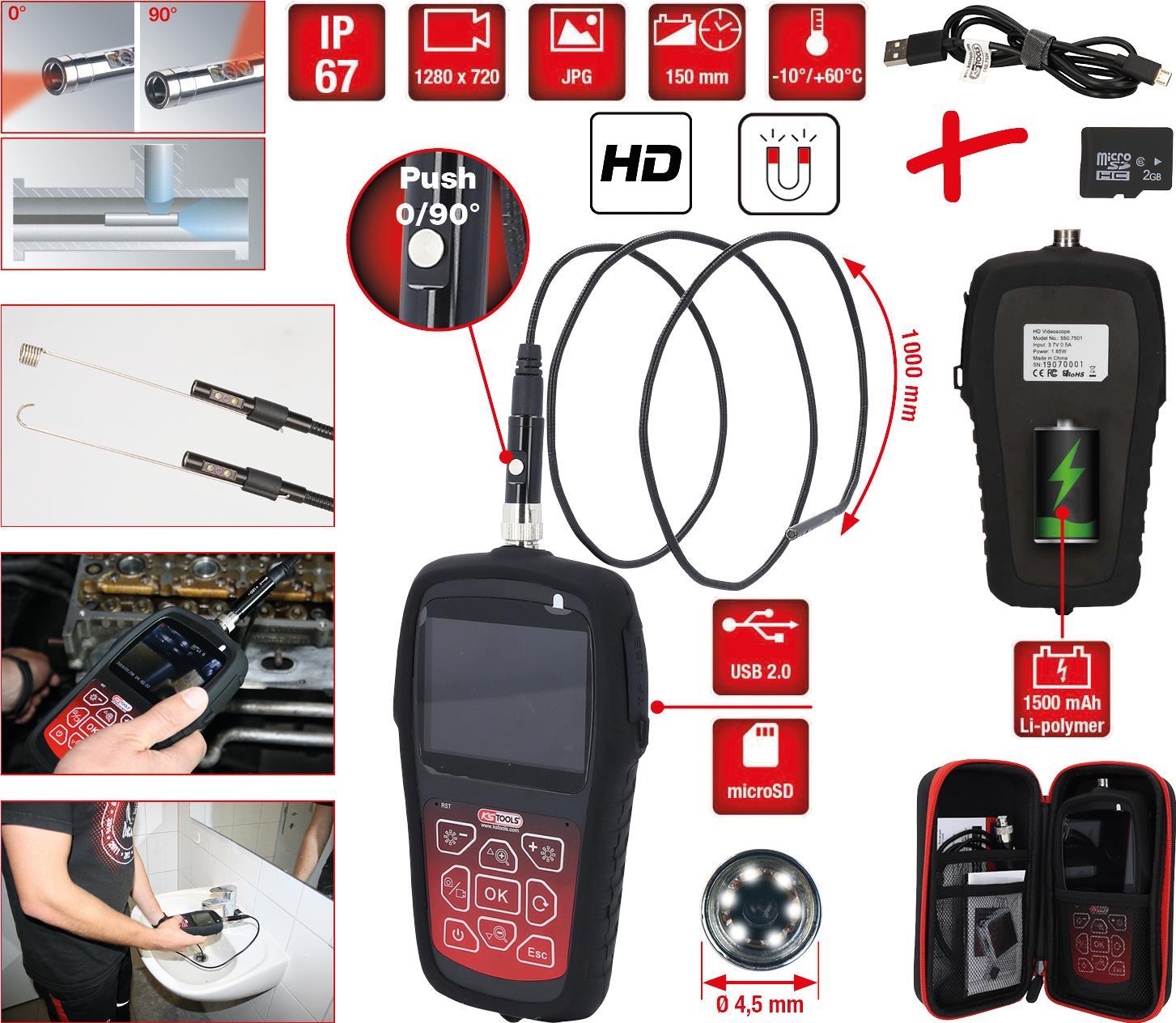 KS TOOLS Werkzeuge-Maschinen GmbH HD-Videoskop-Satz mit Ø 4,5 mm 0° und 90° HD Frontkamera-Sonde, umschaltbar, 7-tlg (550.7530)