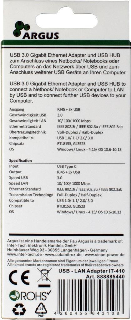 Inter-Tech Argus IT-410 - Hub - 3 x SuperSpeed USB 3.0 + 1 x 10/100/1000 - Desktop (88885440)