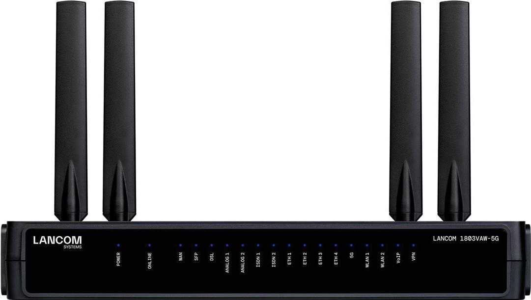 Der LANCOM 1803VAW-5G wurde entwickelt, um ein optimales Netzwerkerlebnis zu bieten, indem er 5G-Fähigkeiten mit zuverlässiger VDSL-Leistung und Wi-Fi 6-Technologie kombiniert. Dieses Gerät verbindet kabelgebundene und kabellose Konnektivität und bietet Datenübertragungsraten von bis zu 1200 Mbit/s, um anspruchsvolle Anwendungen und gleichzeitige Verbindungen zu unterstützen. Mit integrierter Voice-over-IP-Unterstützung (VoIP) und Echounterdrückung verbessert dieser Router die Kommunikation und Effizienz sowohl für den geschäftlichen als auch für den privaten Gebrauch.