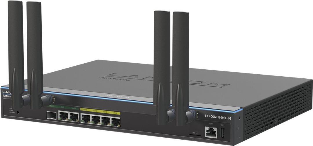 Der LANCOM 1900EF-5G ist die erste Wahl, um flexibel verschiedenste Internetanschlüsse auf einem Gerät zu nutzen. Als enorm leistungsstarkes Multi-WAN-VPN-Gateway kombiniert er das integrierte hochperformante 5G-Modem mit zwei Gigabit Ethernet WAN-Ports zur Anbindung beliebiger externer DSL- oder Kabelmodems für größtmögliche Unabhängigkeit bezüglich der am Standort verfügbaren Internetleitungen. Er unterstützt zudem schnelle Glasfaseranschlüsse. Mit ausgezeichnetem LANCOM IPSec-VPN werden 25 Standorte und mobile Mitarbeiter sicher miteinander vernetzt.