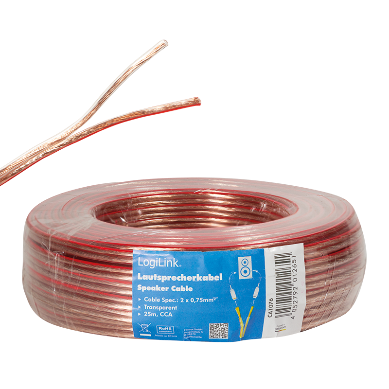 Die Lautsprecherkabel von LogiLink bestehen aus kupferkaschiertem Aluminium (CCA) und verfügen über eine transparente Ummantelung. Beide Innenleiter haben jeweils einen Durchmesser von 0,75 mm2.