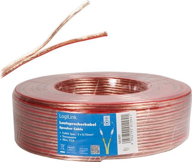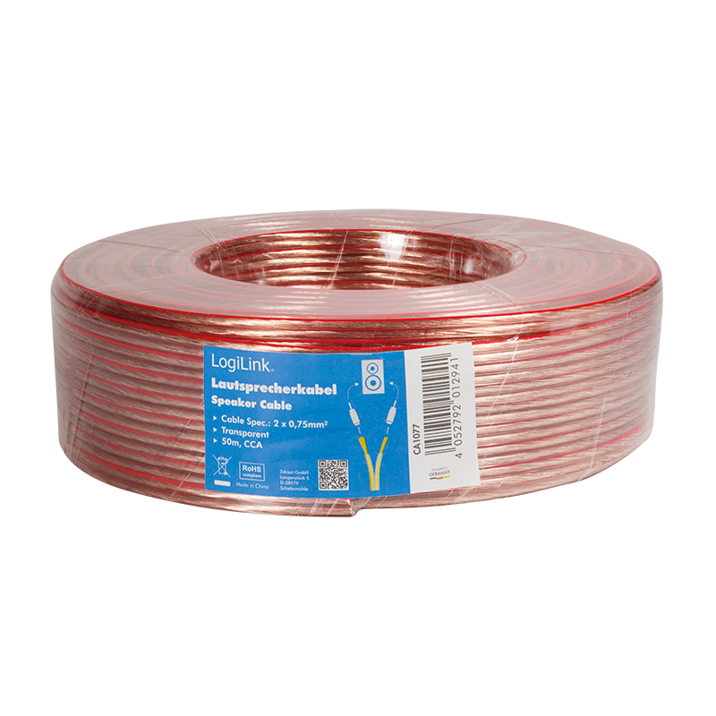 Die Lautsprecherkabel von LogiLink bestehen aus kupferkaschiertem Aluminium (CCA) und verfügen über eine transparente Ummantelung. Beide Innenleiter haben jeweils einen Durchmesser von 0,75 mm2.Hauptmerkmale