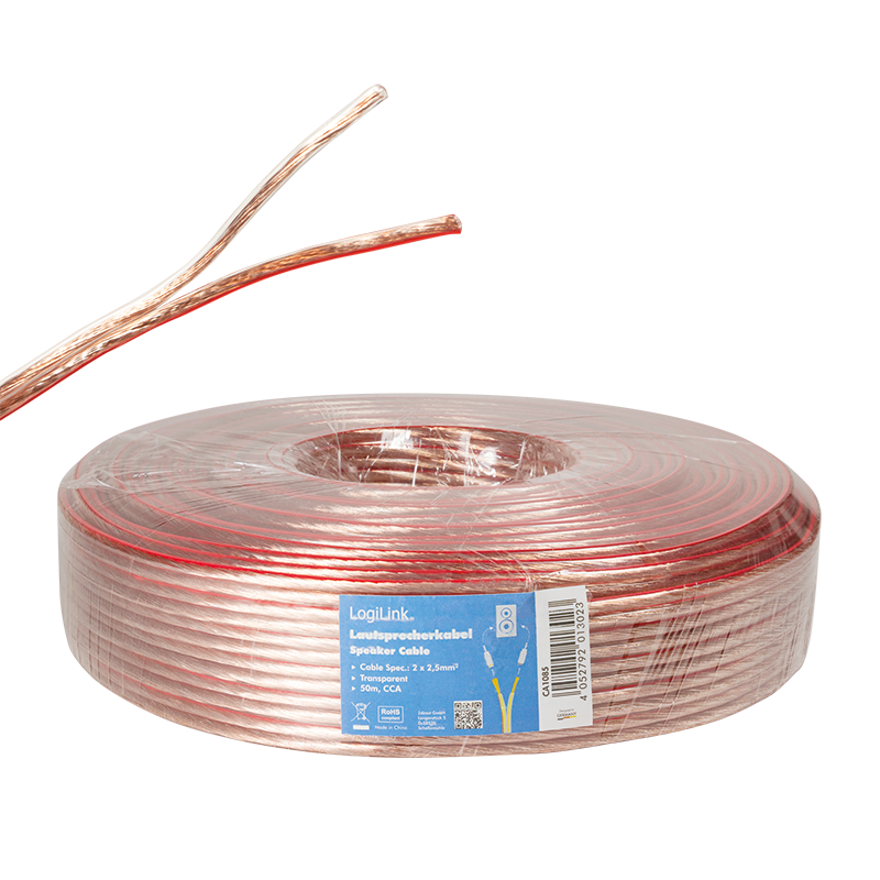 Die Lautsprecherkabel von LogiLink bestehen aus kupferkaschiertem Aluminium (CCA) und verfügen über eine transparente Ummantelung. Beide Innenleiter haben jeweils einen Durchmesser von 2,5 mm2.