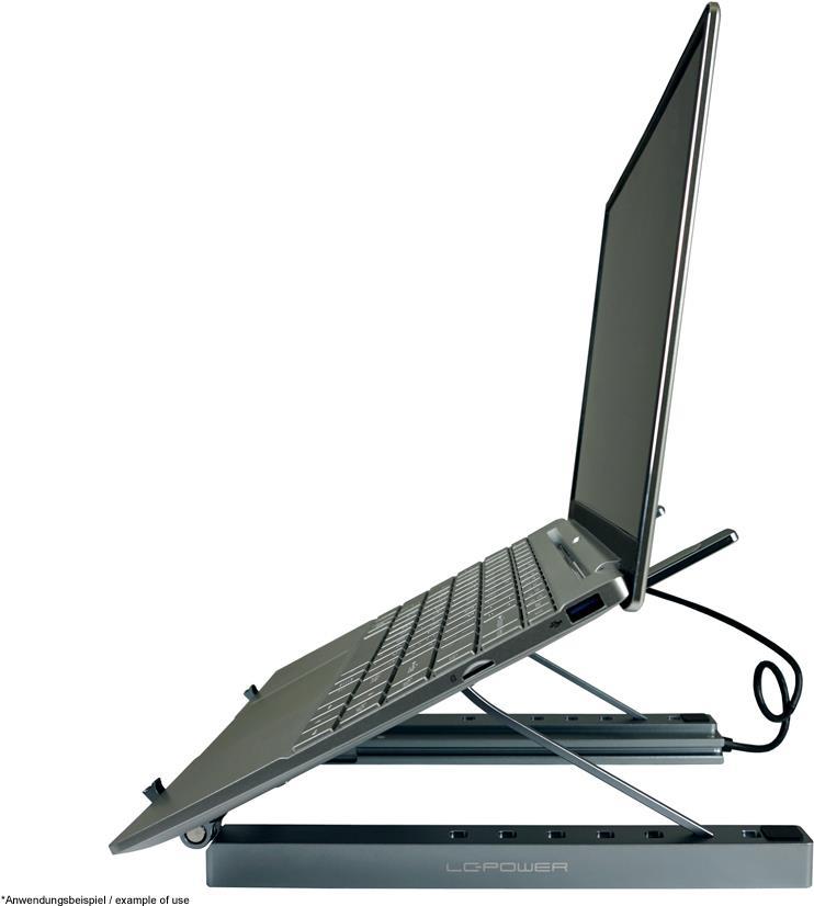 | Leistungsmerkmale | Gummifüße, zusammenklappbar, Gummipolster, Aluminium/Kunststofgehäuse, einstellbarer Notebookhalter |