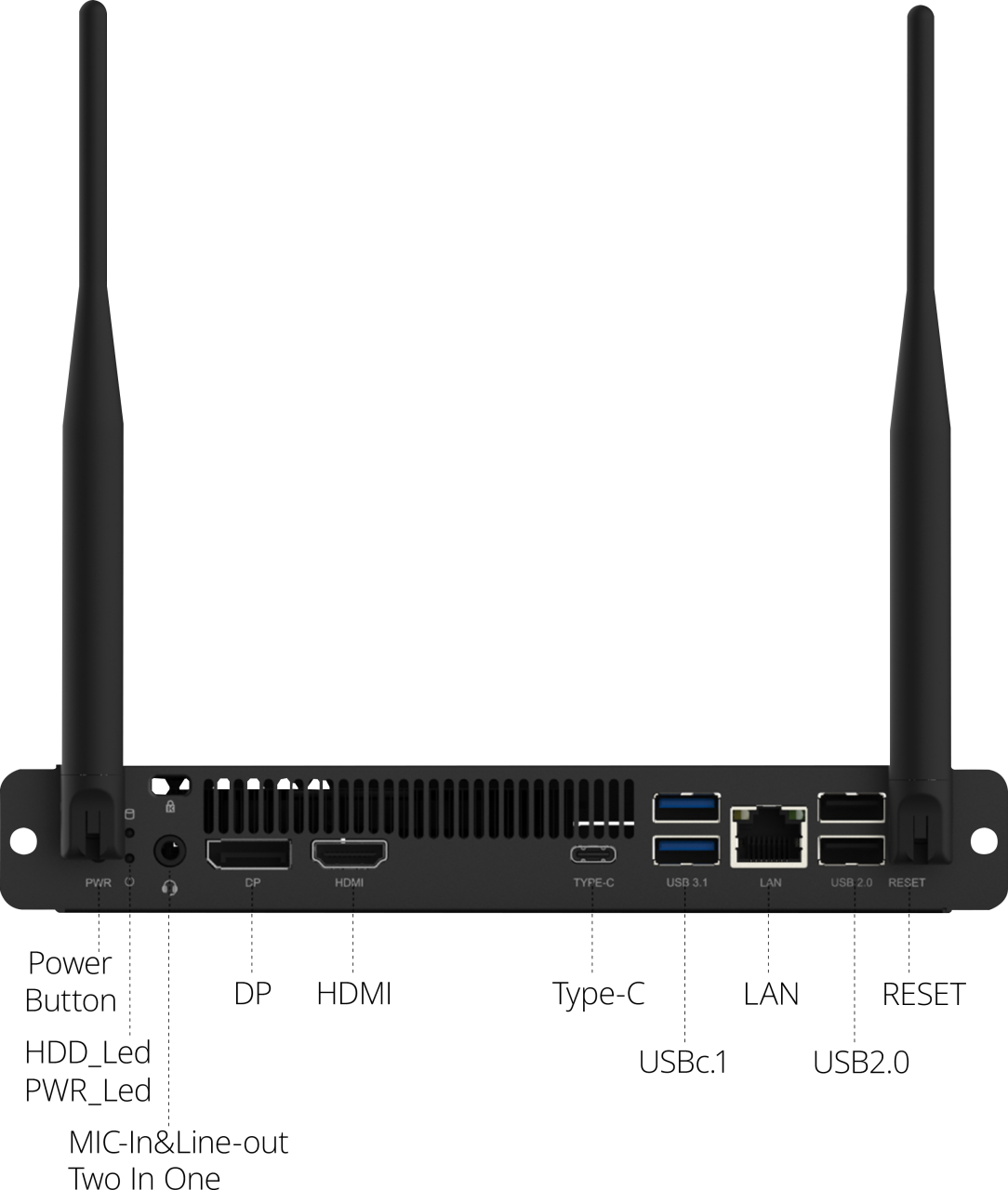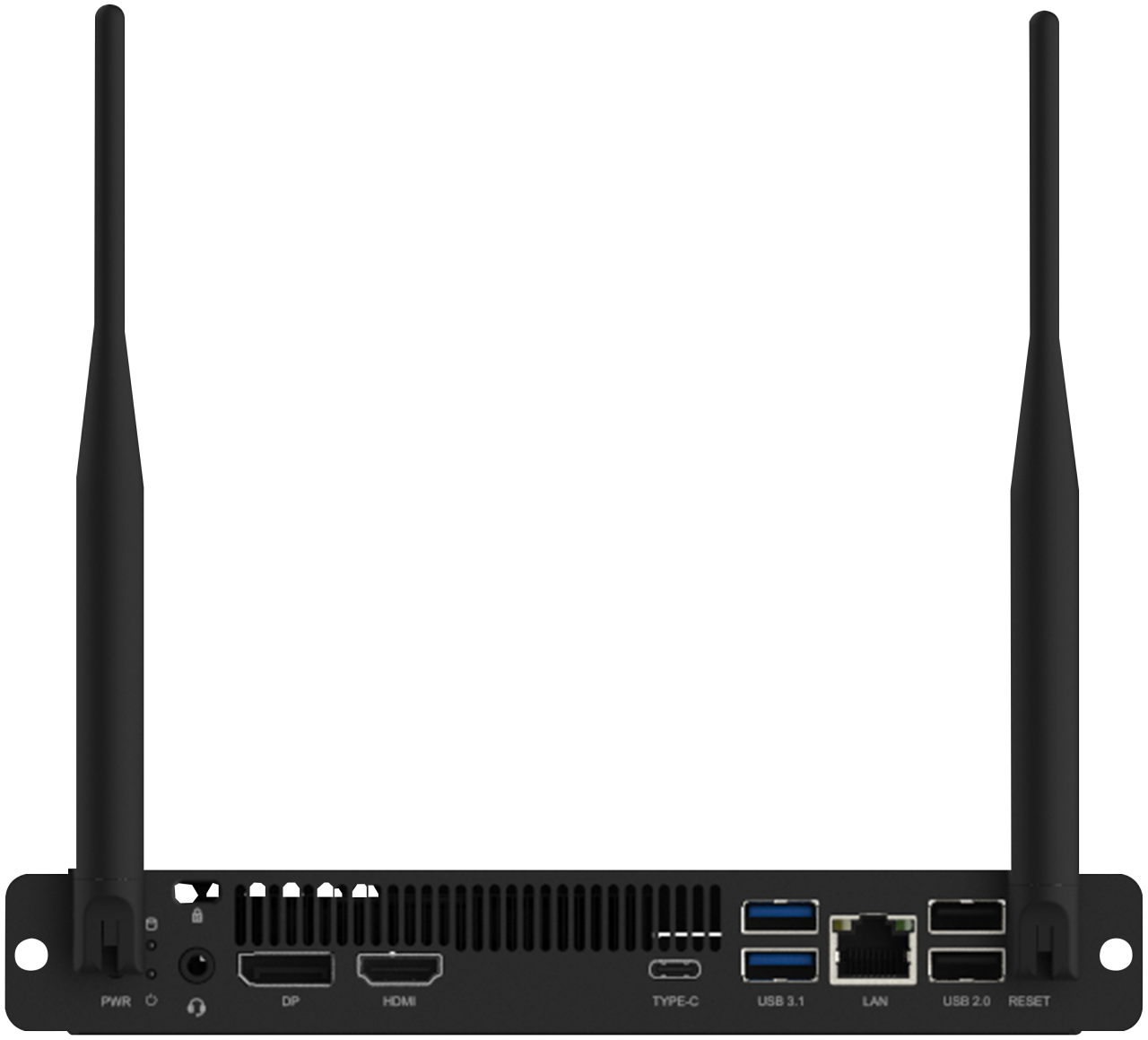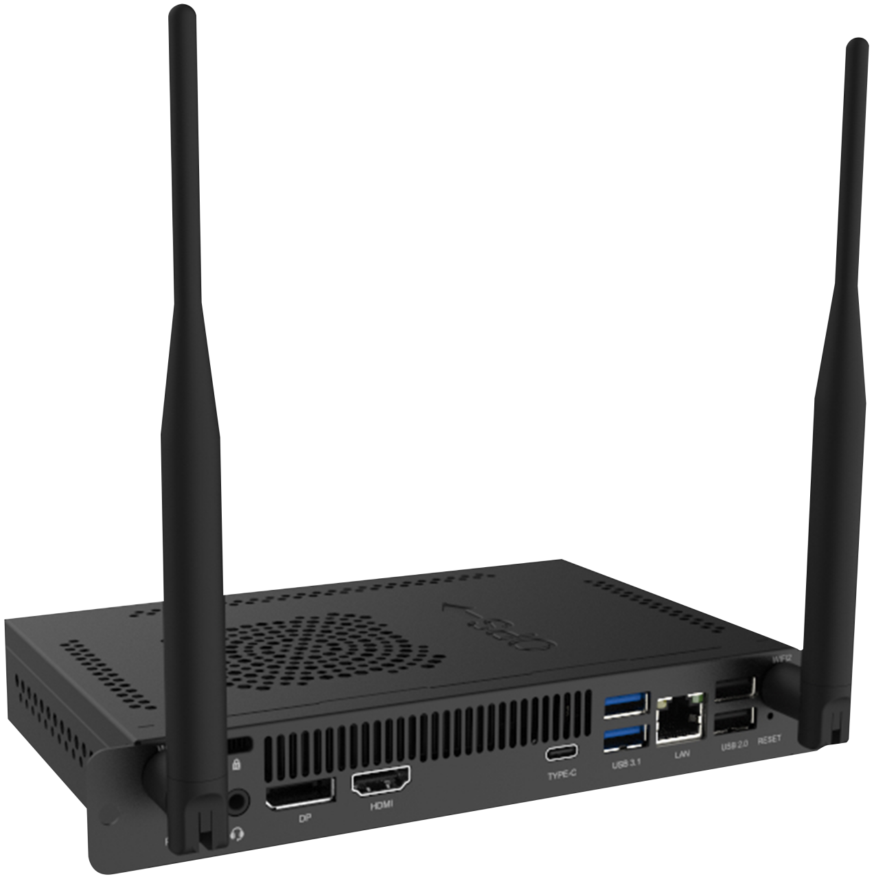 Intel® Core™ Prozessor der 12. Generation. OPS-Standardformat. Dual Channel SDRAM DDR4 3200 MHz Speicher. 256 GB M.2 SSD-Festplatte. 802.11ax Wi-Fi 6 Modul. Gigabit-Ethernet-Adapter. Bluetooth 5.2. Unterstützt Bildschirmauflösungen von 4K bei 60Hz. Unterstützt Bildschirmauflösungen von 5k@60Hz im 21:9 Format.