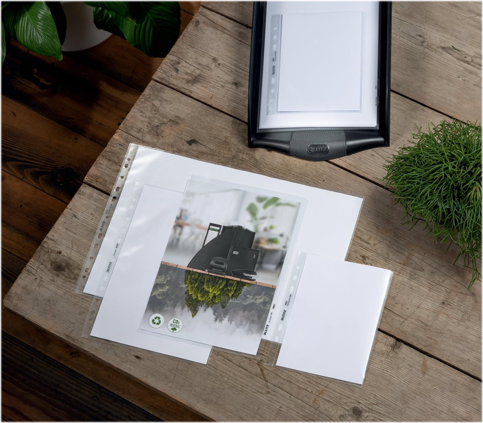 Umweltfreundliche Sichthülle im Format A4 in Premiumqualität zum Schutz von Dokumenten unterwegs und zum Organisieren von Papieren bei der Arbeit und zu Hause. Hergestellt aus 90% vor Gebrauch recyceltem Kunststoff (Industrieabfälle-/ Verschnitte bzw. Produktionsreste; extern geprüft und von UL zertifiziert), 100% recycelbar. Diese robuste und praktische Sichthülle ist die perfekte Ergänzung zu anderen Produkten der Leitz Recycle Serie und ist auf Langlebigkeit ausgelegt. Moderne und zeitgemäße umweltfreundliche Büroprodukte, die zu Hause und im Büro großartig aussehen. Mit der neuen umweltfreundlichen Recycle Serie von Leitz helfen Sie, unsere Umwelt zu schützen und sorgen gleichzeitig für ein attraktives und umweltfreundliches Erscheinungsbild Ihres Büros.