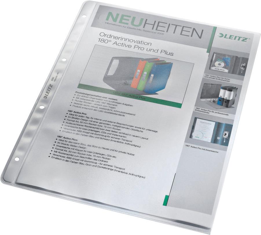 Hochwertige Prospekthüllen mit einer klaren, matten Oberfläche, ideal für den täglichen Gebrauch zu Hause, im Büro oder in der Schule. Die 4-fach-Lochung ermöglicht die bequeme Ablage in Ordnern und Ringbüchern. Dank der oberen Öffnung ist der Zugriff auf die Unterlagen sehr einfach und erspart das zusätzliche Öffnen der Ordnermechanik. Dokumentenechtes und säurefreies Material gewährleistet den langfristigen Schutz der Dokumente. Hergestellt aus PP-Kunststoff (Polypropylen) mit 30% vor Gebrauch recyceltem Kunststoff (Industrieabfälle/ -verschnitte bzw. Produktionsreste), zu 100% recycelbar.