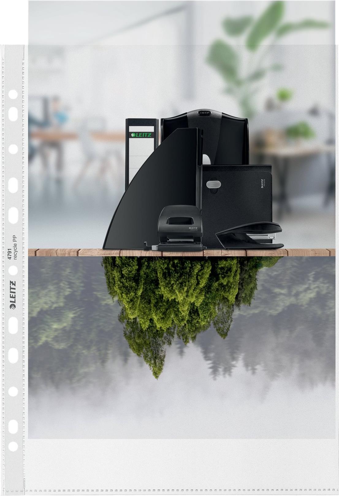 Umweltfreundliche Prospekthülle im Format A4 in Premiumqualität zum Schutz von Dokumenten unterwegs und zum Organisieren von Papieren bei der Arbeit und zu Hause. Mit Universallochung für den universellen Einsatz. Hergestellt aus 90% vor Gebrauch recyceltem Kunststoff (Industrieabfälle-/ Verschnitte bzw. Produktionsreste; extern geprüft und von UL zertifiziert) und 100% recycelbar. Diese robuste und praktische Prospekthülle ist die perfekte Ergänzung zu anderen Produkten der Leitz Recycle Serie und ist auf Langlebigkeit ausgelegt. Moderne und zeitgemäße umweltfreundliche Büroprodukte, die zu Hause und im Büro großartig aussehen. Mit der neuen umweltfreundlichen Recycle Serie von Leitz helfen Sie, unsere Umwelt zu schützen und sorgen gleichzeitig für ein attraktives und umweltfreundliches Erscheinungsbild Ihres Büros.