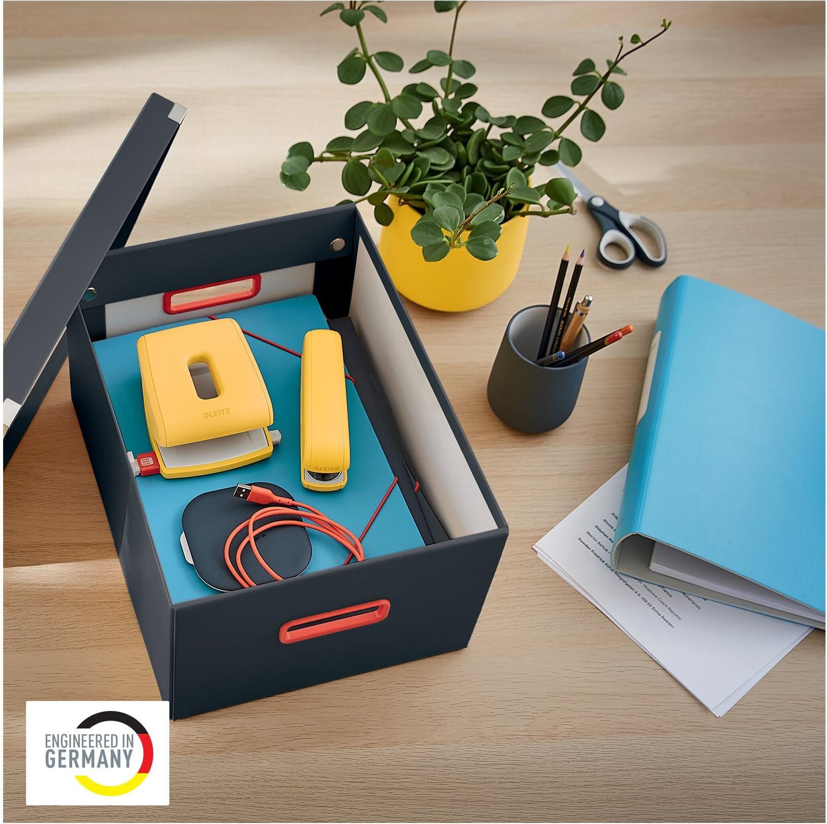 Fühlen Sie sich mit der Leitz Cosy Serie überall wie zu Hause, ganz gleich, wo Ihr Arbeitstag Sie hinführt. Mit seinem minimalistischen Design und den einladenden Farben können Sie Ihrem Arbeitsbereich Stil und Farbe verleihen. Die Click & Store Cosy Aufbewahrungs- und Transportbox Mittel mit Deckel und praktischen, stilvollen roten Greifausschnitten bietet Platz für alle Ihre A4-Dokumente, Fotos und andere kleinere Gegenstände. Mit ihrem platzsparenden Design lässt sich diese faltbare Aufbewahrungsbox leicht verstauen, wenn sie nicht gebraucht wird. Die hochwertigen Leitz Click & Store Cosy Aufbewahrungsboxen aus Karton sind ideal, um in Ihrem Zuhause und Büro für Ordnung zu sorgen, damit Sie sich den ganzen Tag entspannt und produktiv fühlen. Volumen 16 Liter.