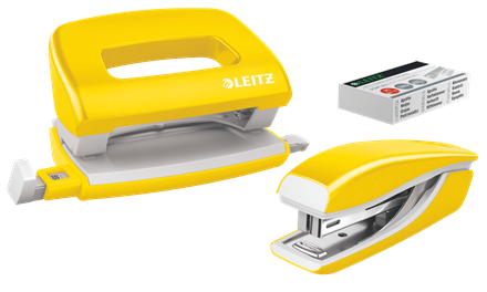 Set aus Mini-Metallheftgerät und -Locher in auffallenden WOW Farben für den Einsatz im Büro, zu Hause oder unterwegs.
