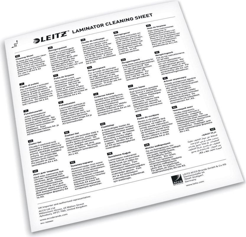 Diese Reinigungsblätter für Laminiergeräte von Leitz sind ideal für Schulen und Büros, in denen häufig laminiert wird. Die A4-Reinigungsblätter entfernen mühelos überschüssigen Klebstoff, Staub und Schmutz von den Laminierrollen und gewährleisten so optimale Laminierergebnisse. Empfohlen für die Verwendung nach Stapellaminierungen oder Aufträgen mit hohem Volumen, um zu verhindern, dass sich Klebstoffreste auf den Rollen ansammeln, was zu Papierstaus führen kann. Regelmäßige Anwendung hilft dabei, die Lebensdauer Ihres Laminiergeräts zu verlängern und sorgt für einen reibungslosen Betrieb. Kompatibel mit allen A3- und A4-Laminiergeräten, jede Packung enthält 5 x A4-Kartonbögen.